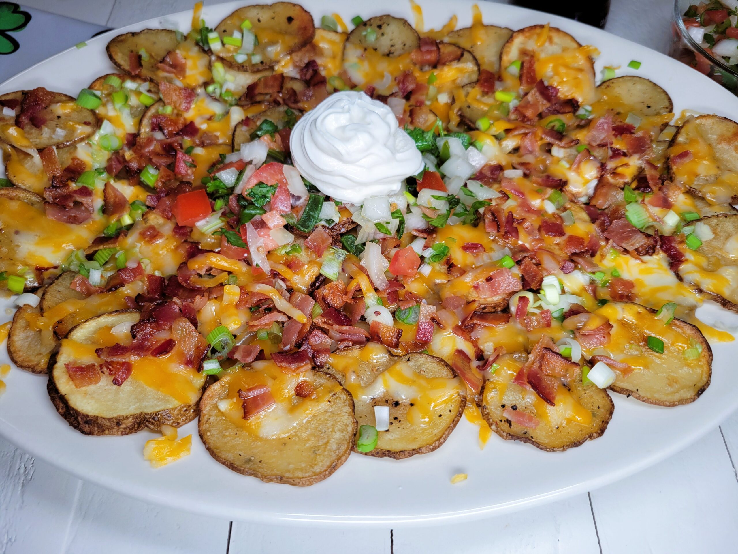 Crispy sliced potatoes, melted cheese, bacon bits, green onions, Pico de Gallo & sour cream.