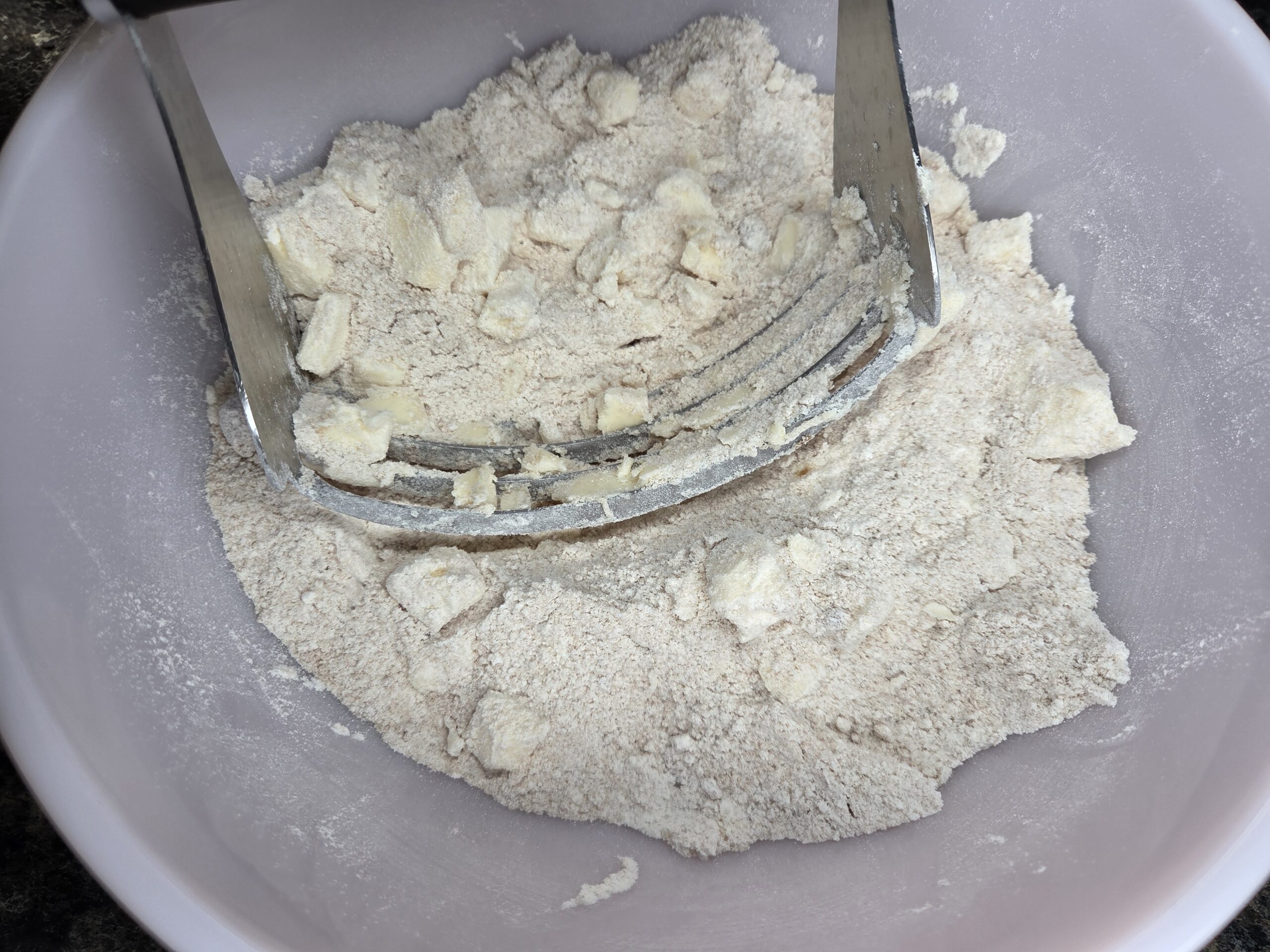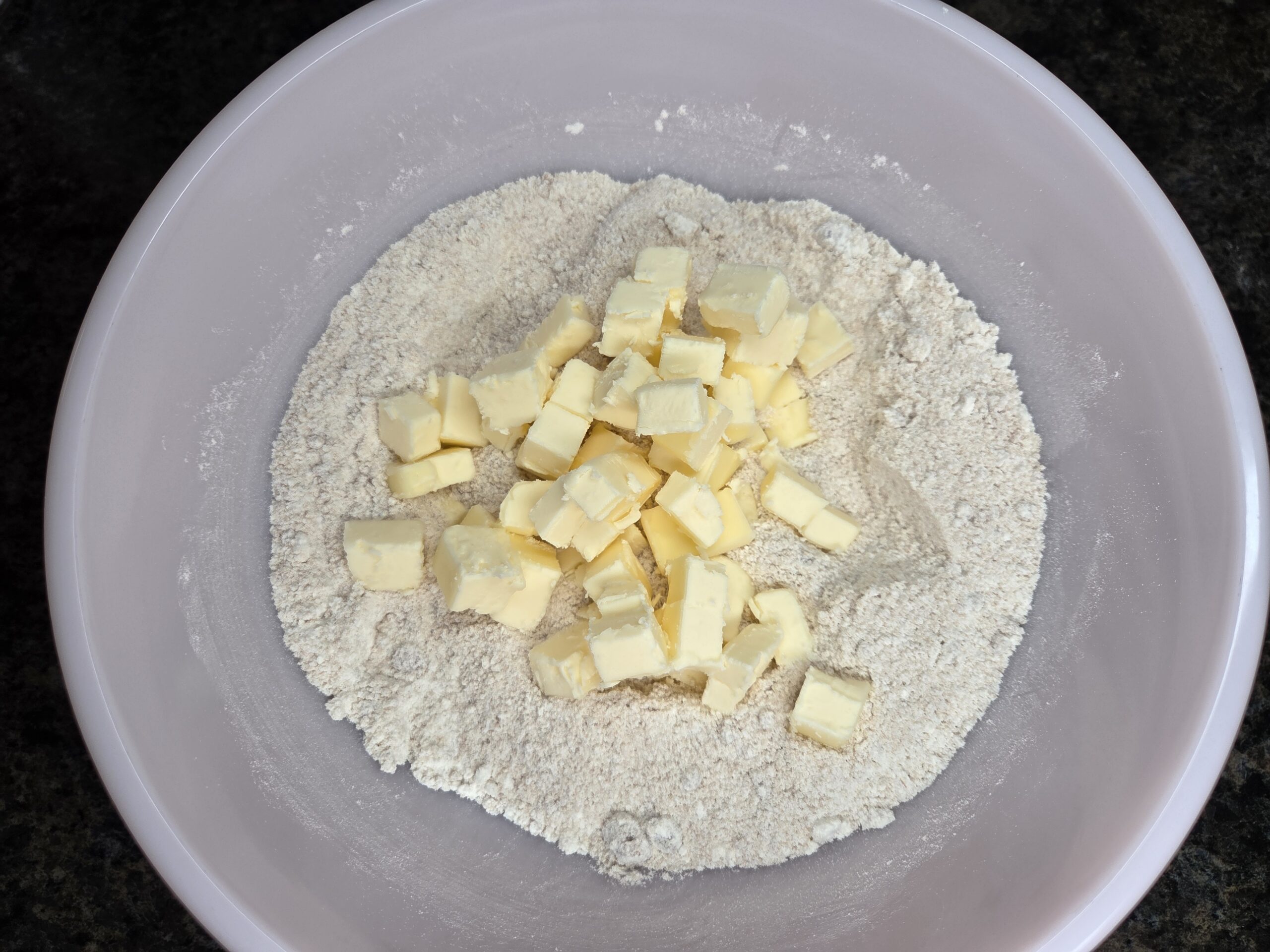 Cut cold, cubed butter into the flour and brown sugar mixture until it resembles a coarse meal.