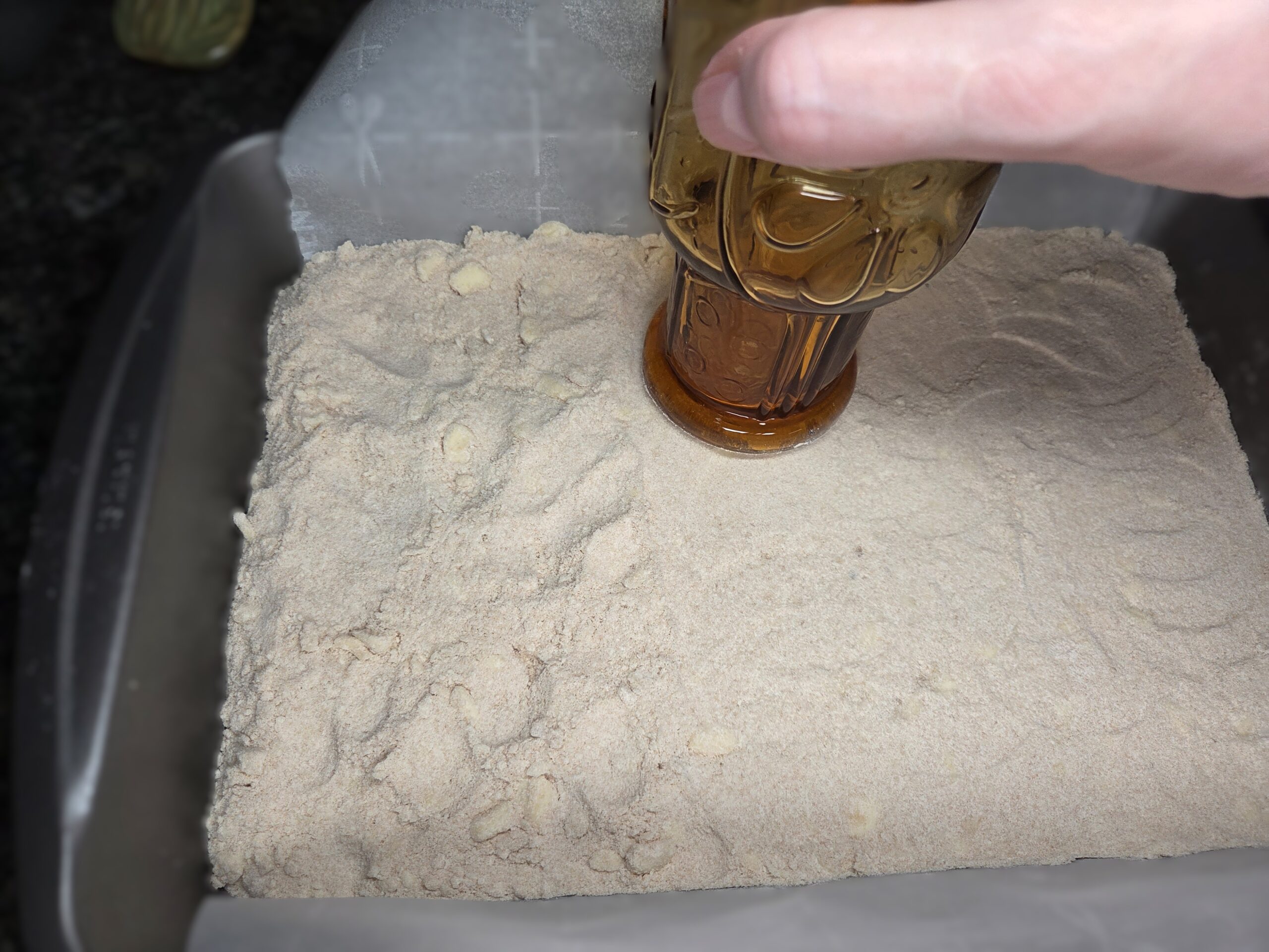 Pour the crumb crust into the prepared baking pan. Press it down firmly using a drinking glass. Bake for 15-20 minutes, or until the crust turns a light golden brown.