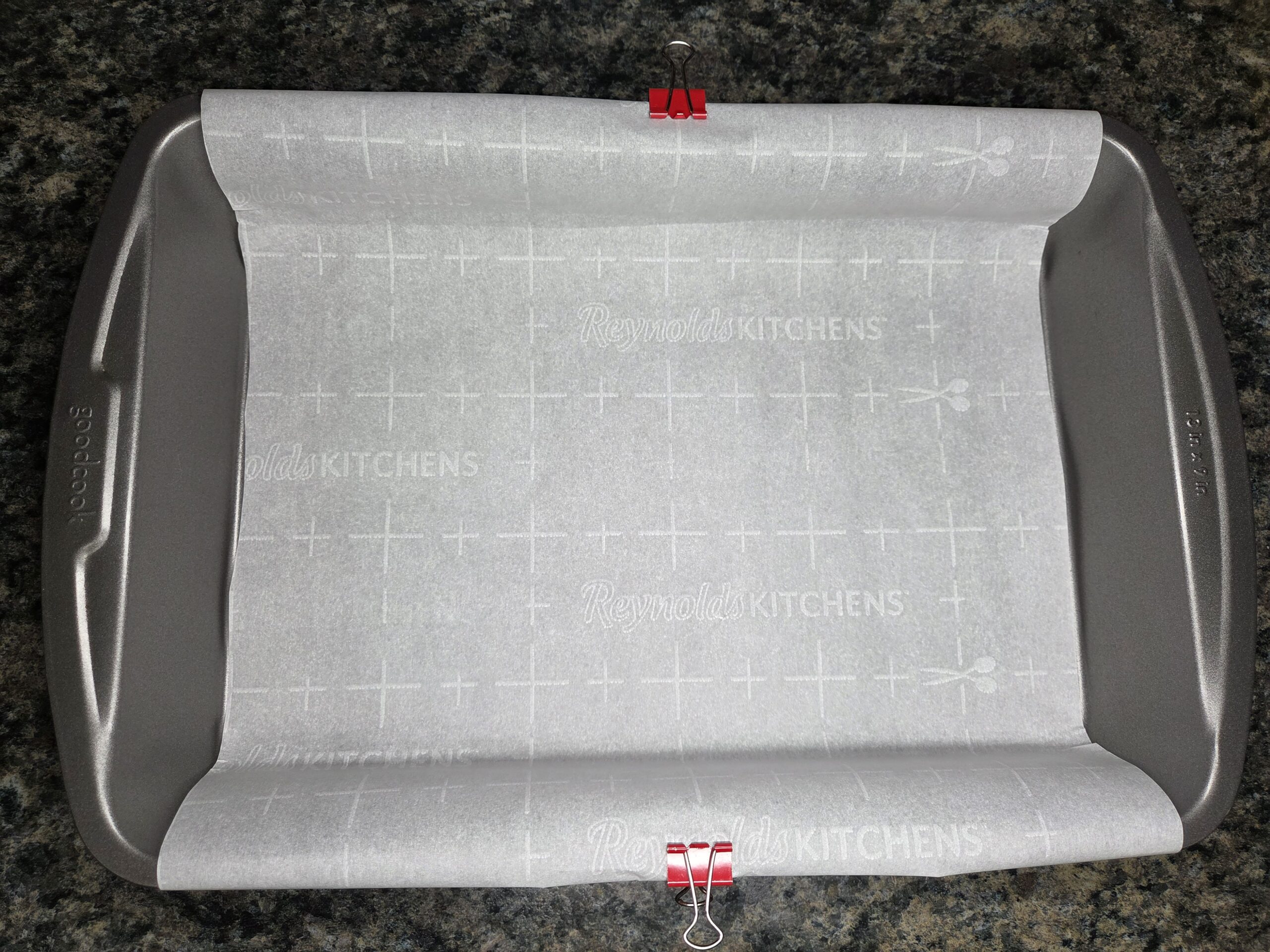 Preheat your oven to 350°F. Line a 9x13-inch baking pan with parchment paper and spray with non-stick cooking spray..