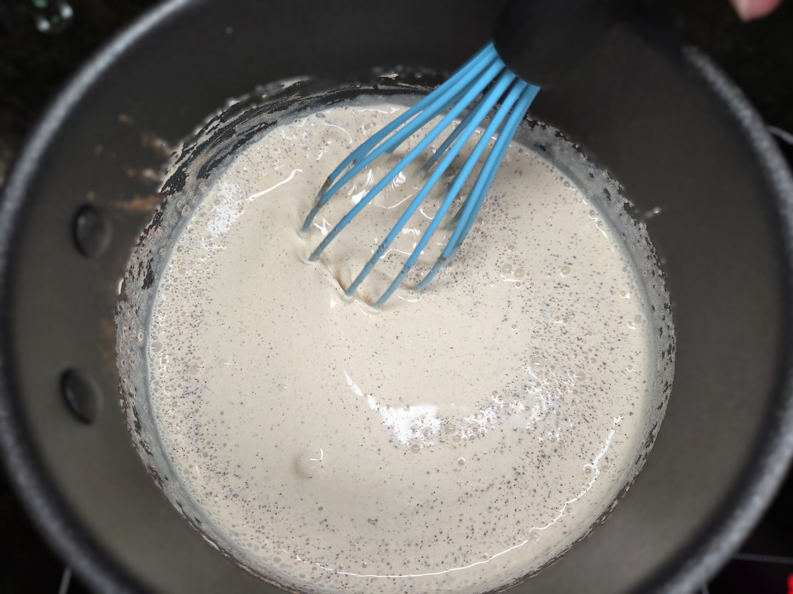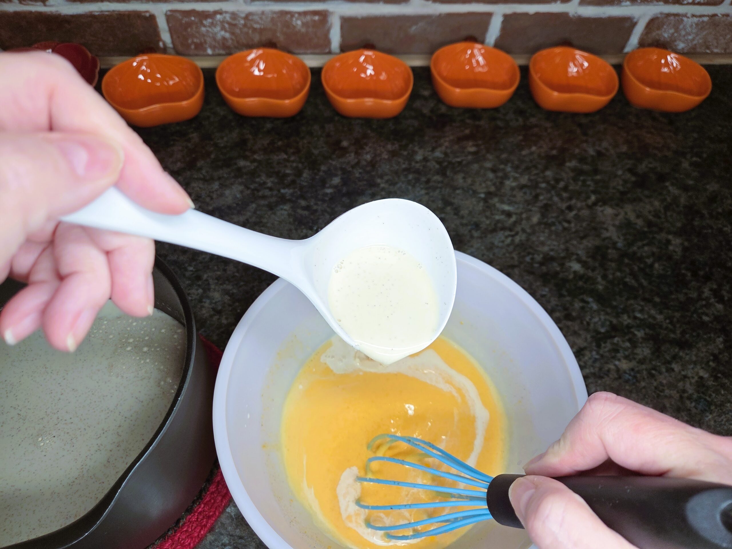 Slowly pour the cream mixture into the egg yolk and sugar mixture, whisking constantly to ensure everything is thoroughly blended.
