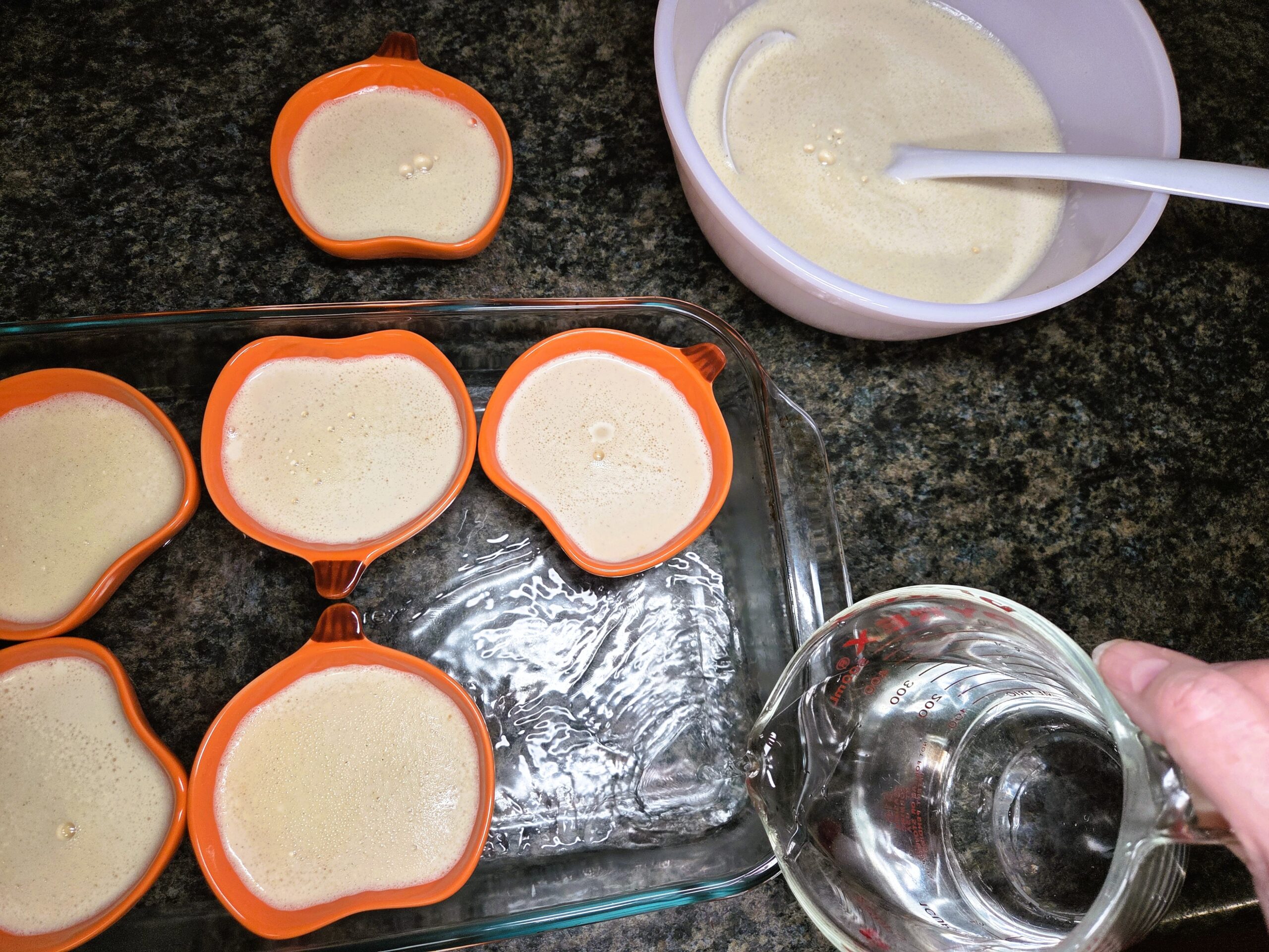 Fill the ramekins with custard and arrange the 6-ounce ramekins in a 9x13-inch baking dish. Pour hot water into the dish until it reaches halfway up the sides of the ramekins.