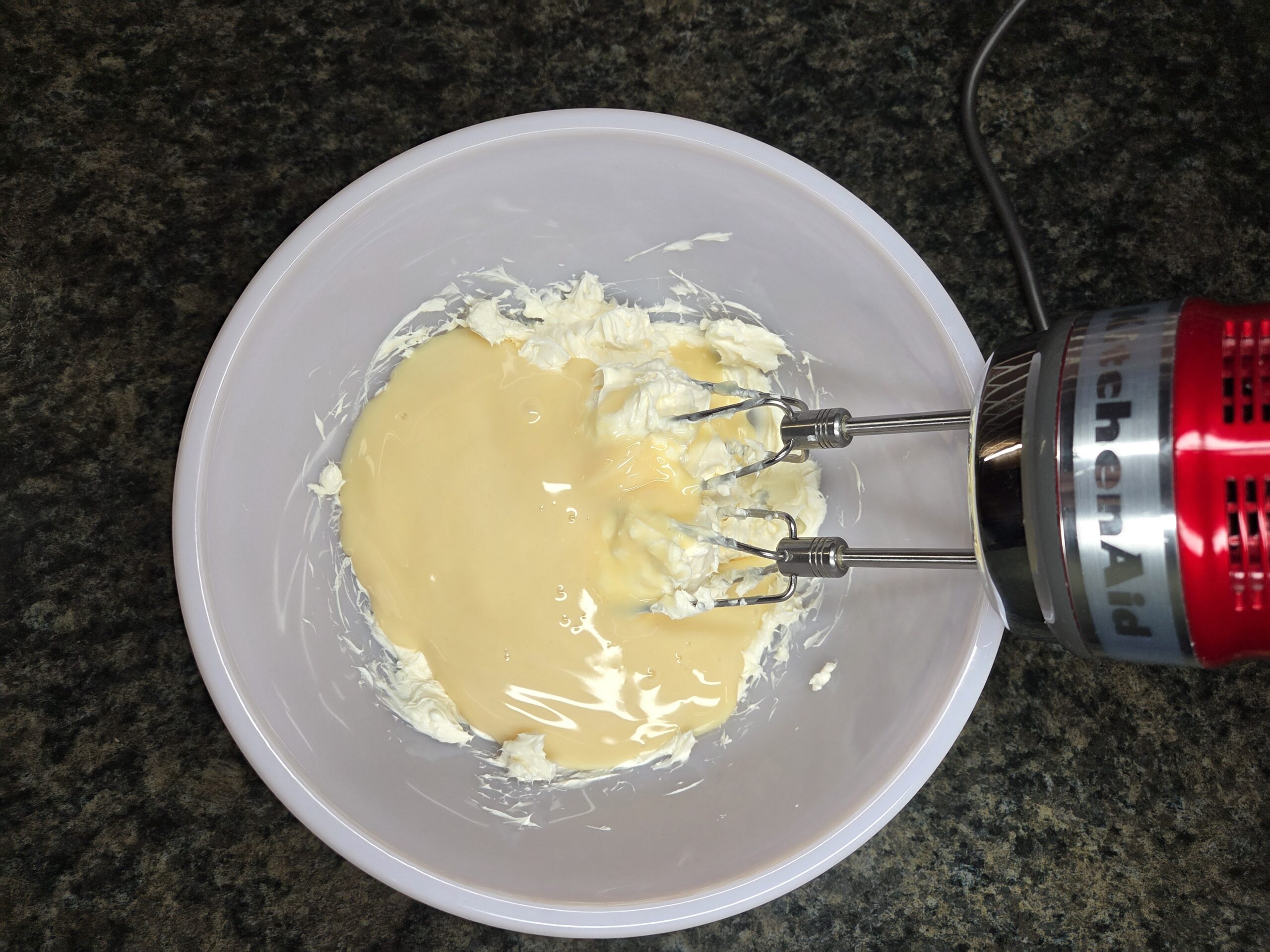 In a large mixing bowl, beat 8 ounces of room‑temperature cream cheese with an electric mixer until it becomes smooth and fluffy. Once the cream cheese is well whipped, add one 14‑ounce can of sweetened condensed milk and continue mixing until the mixture is creamy and fully combined.