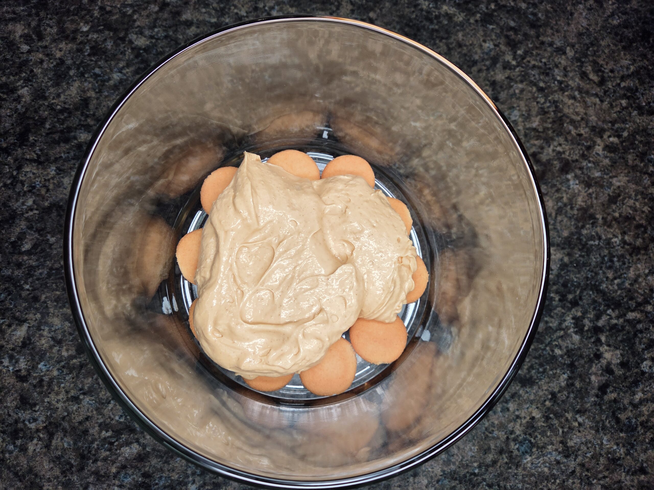 2nd layer: Spread half of the pudding mixture evenly over the layer of Nilla wafers, smoothing it to the edges of the dish.