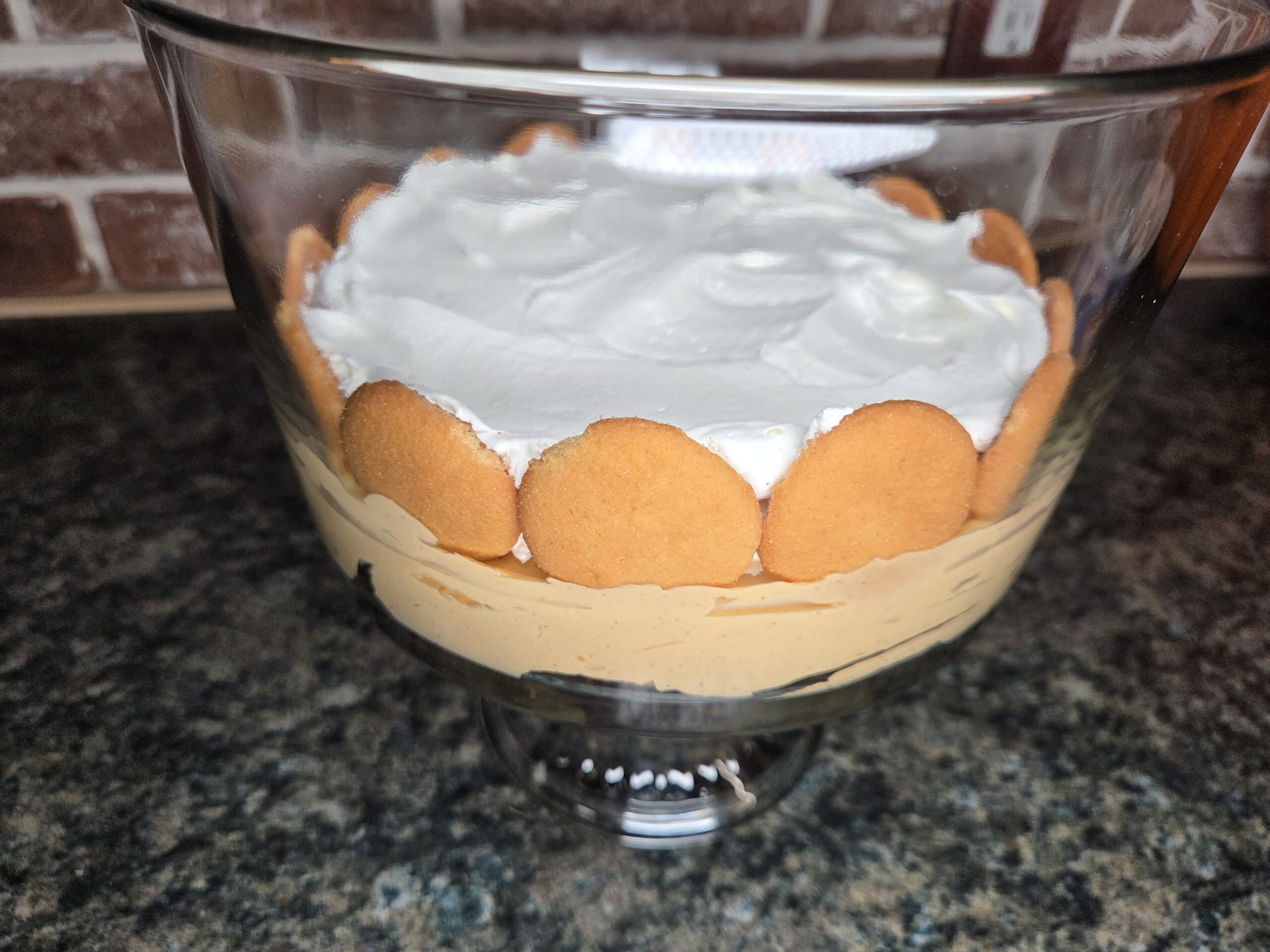 4th layer: Fill the dish with whipped topping to the tops of the cookies. Approximately 2 cups.