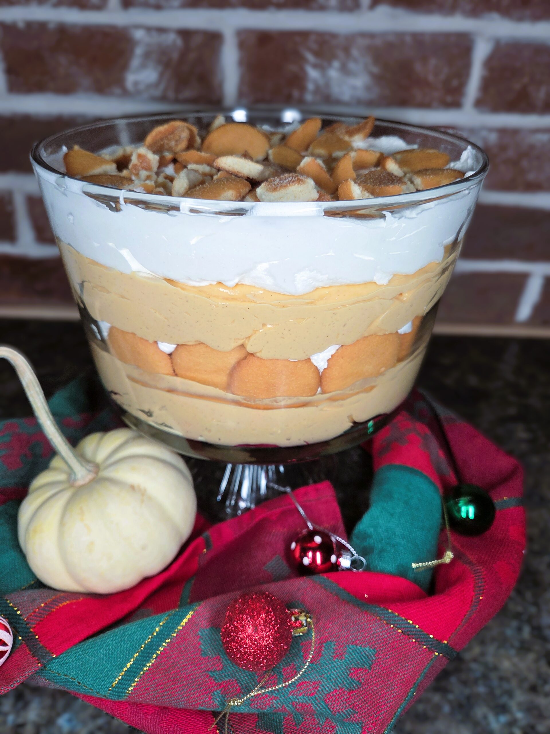 No-Bake Pumpkin Spice Pudding Trifle made with smooth pumpkin spice pudding, fluffy whipped topping, and layers of crunchy cookies.