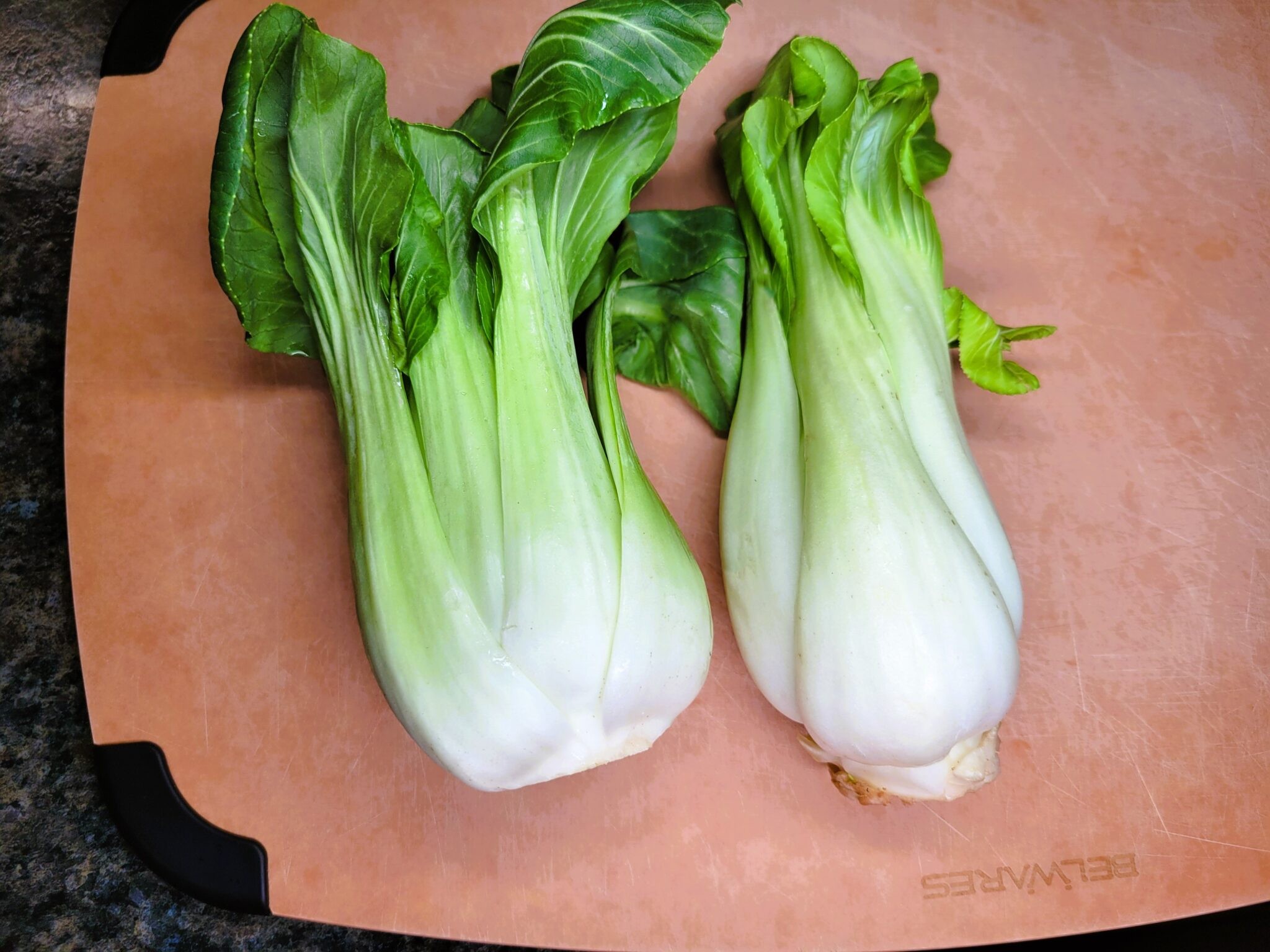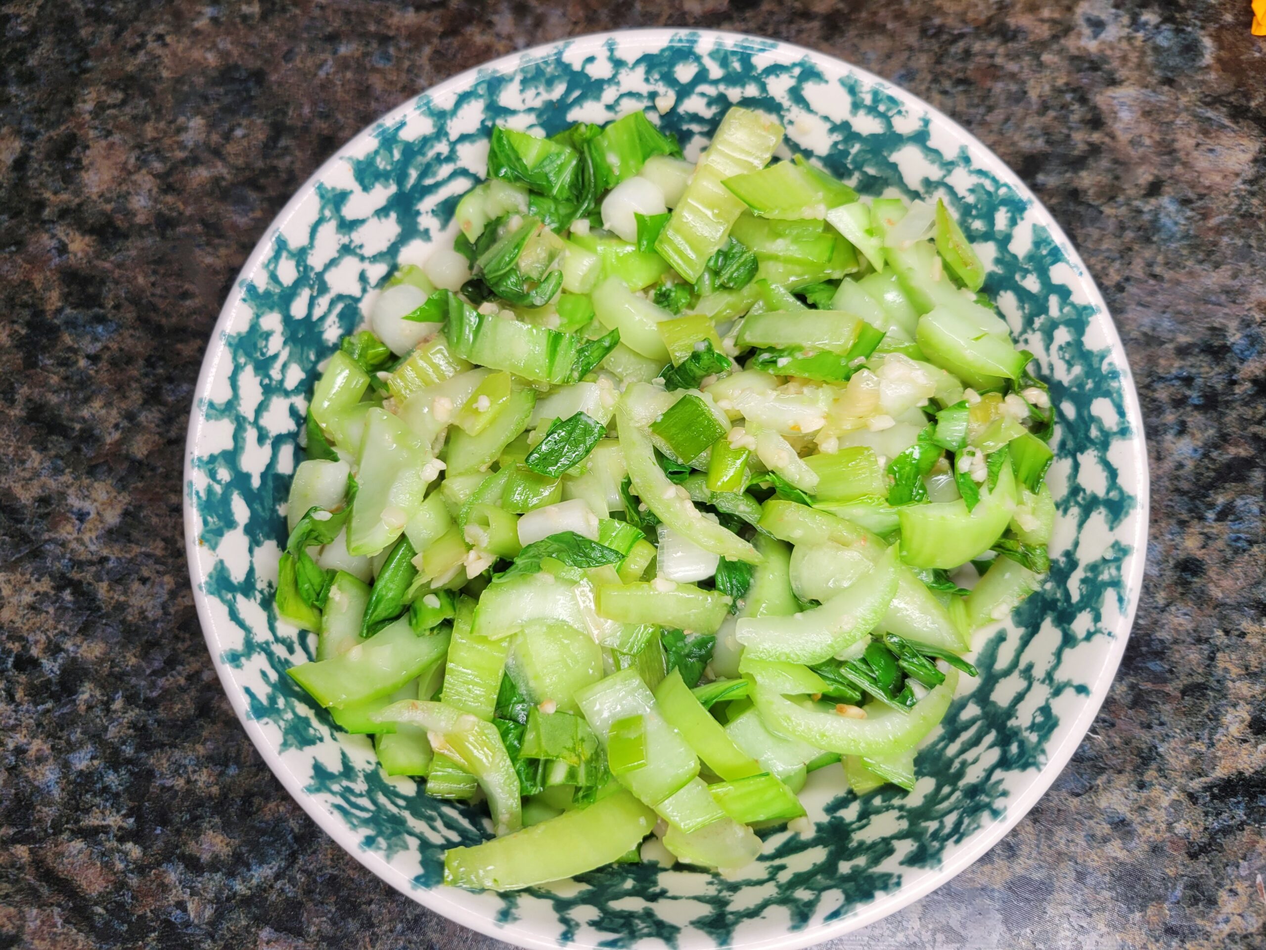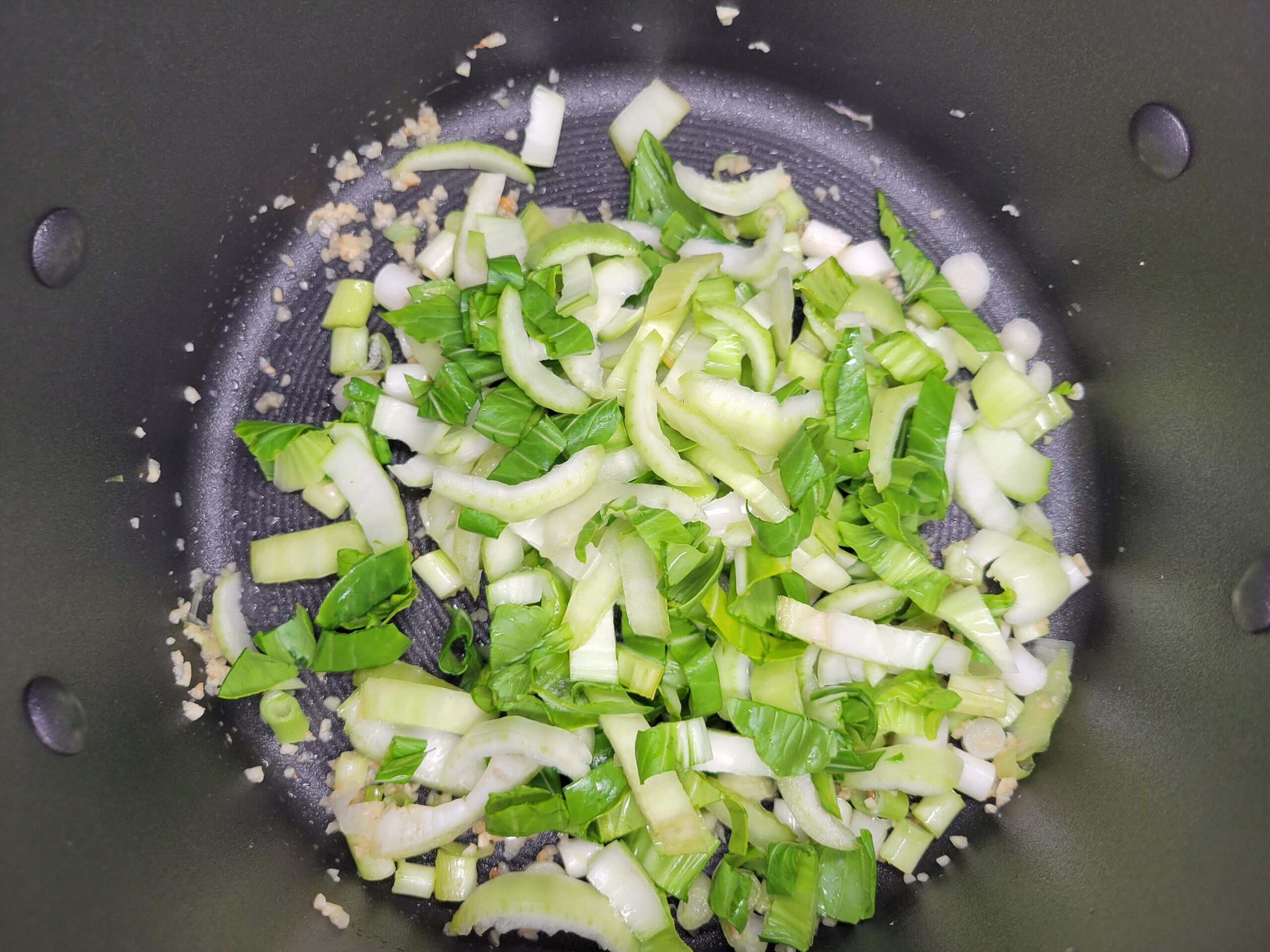 Wash and thinly slice Bok choy and green onions. Mince garlic. Grate carrot and set aside. In a large pot add 1 teaspoon of sesame oil on medium heat. Add Bok choy, green onions, and half of the garlic to the pot, sauteing for a few minutes. Remove sautéed Bok choy mixture from the pot and set aside. No need to wipe pot.