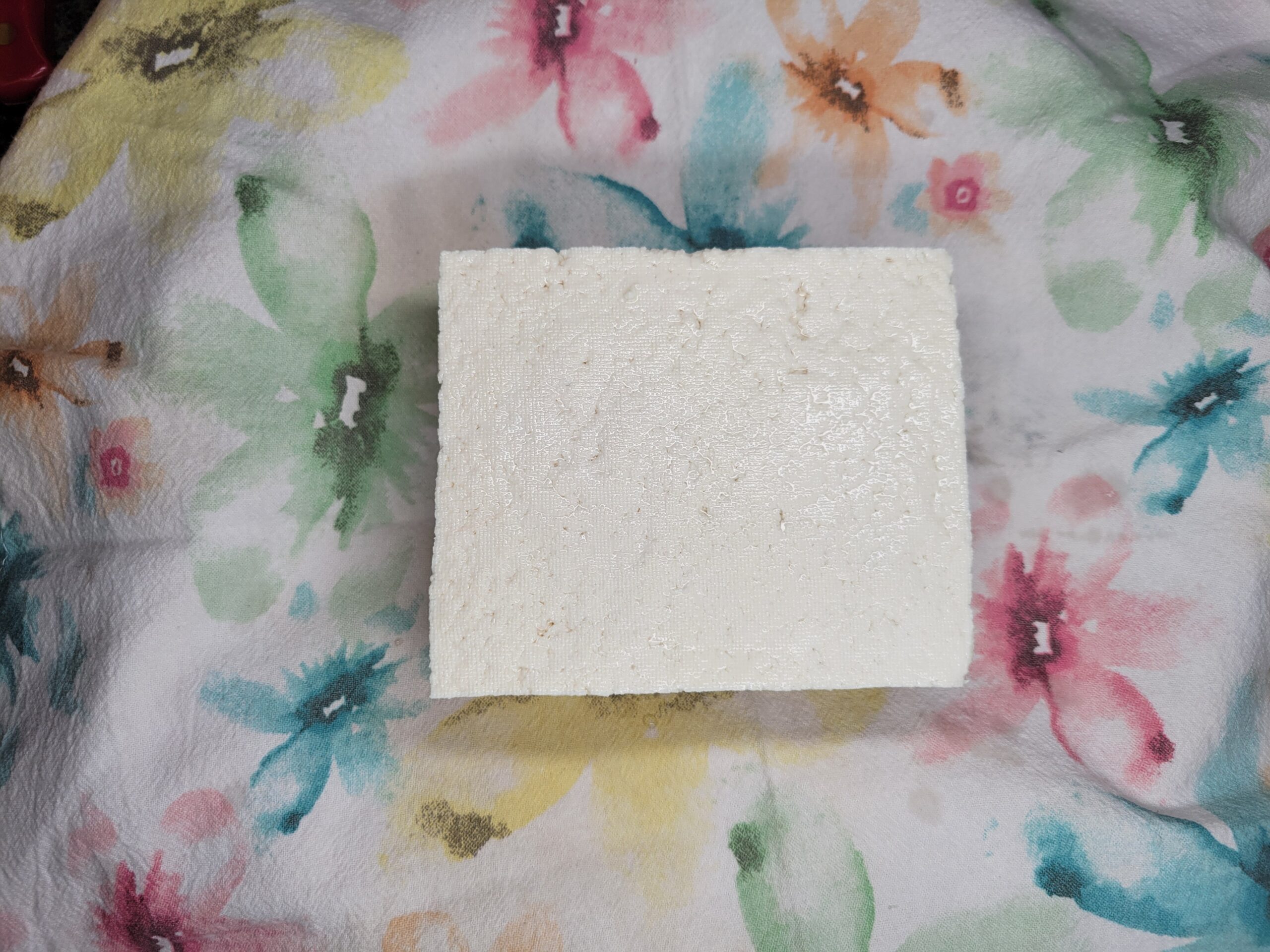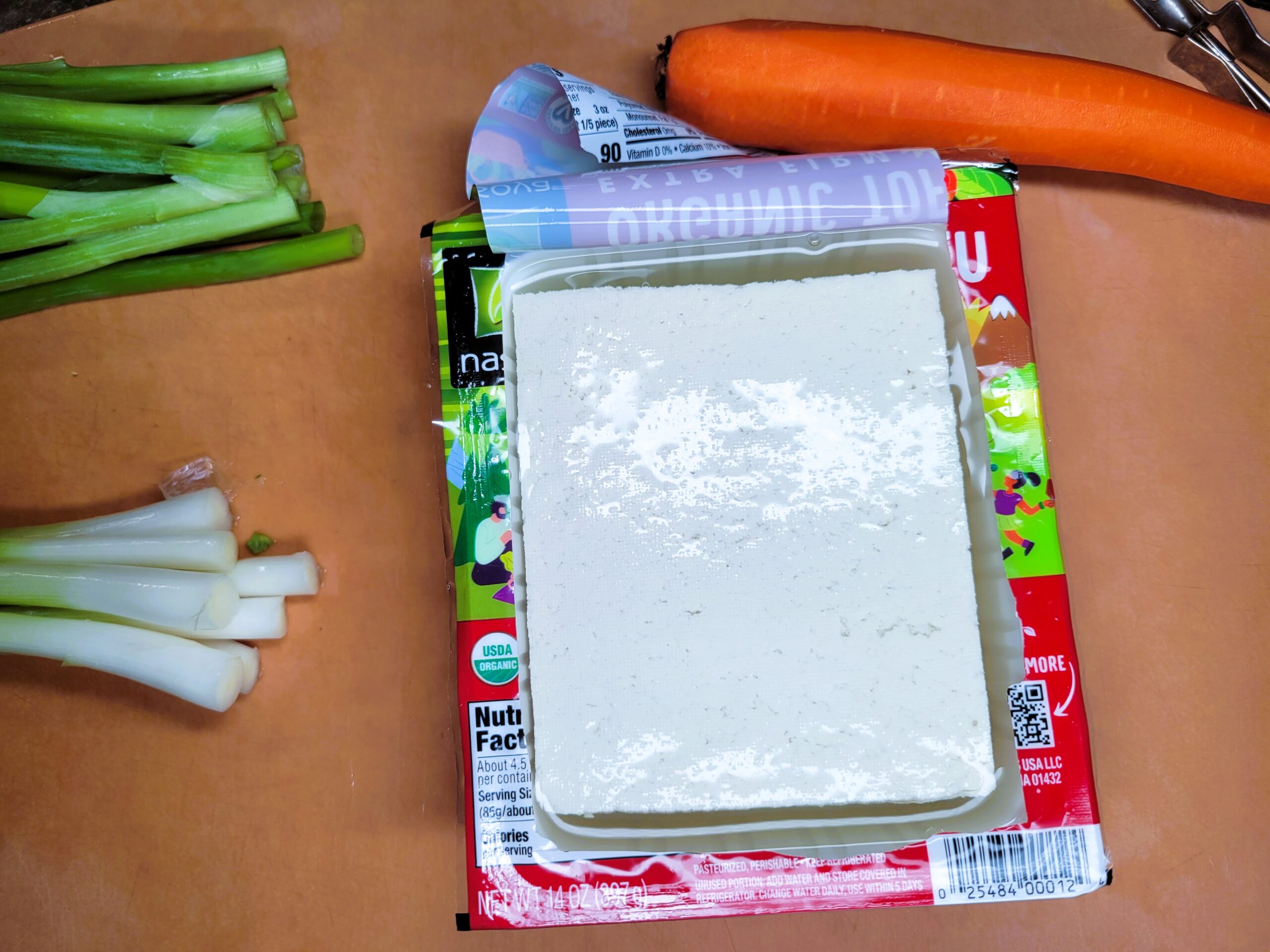 Open tofu and drain off liquid. Wrap the tofu in a kitchen towel to absorb liquid. Place a small kitchen plate on top of the wrapped tofu, to help remove some of the moisture. Removing some of the moisture from the tofu will help to make it crispy. Allow it to sit undisturbed for 15-20 minutes.