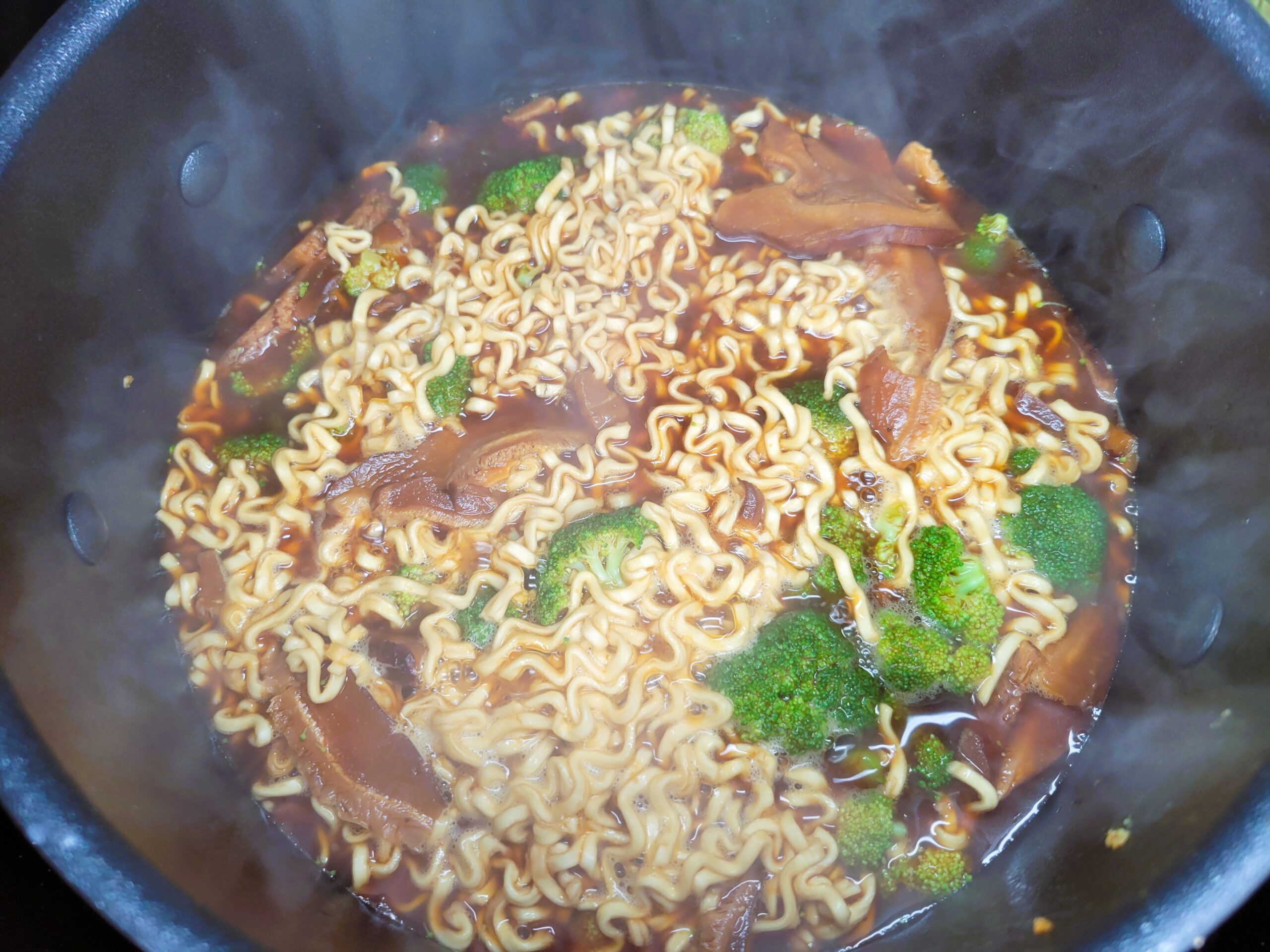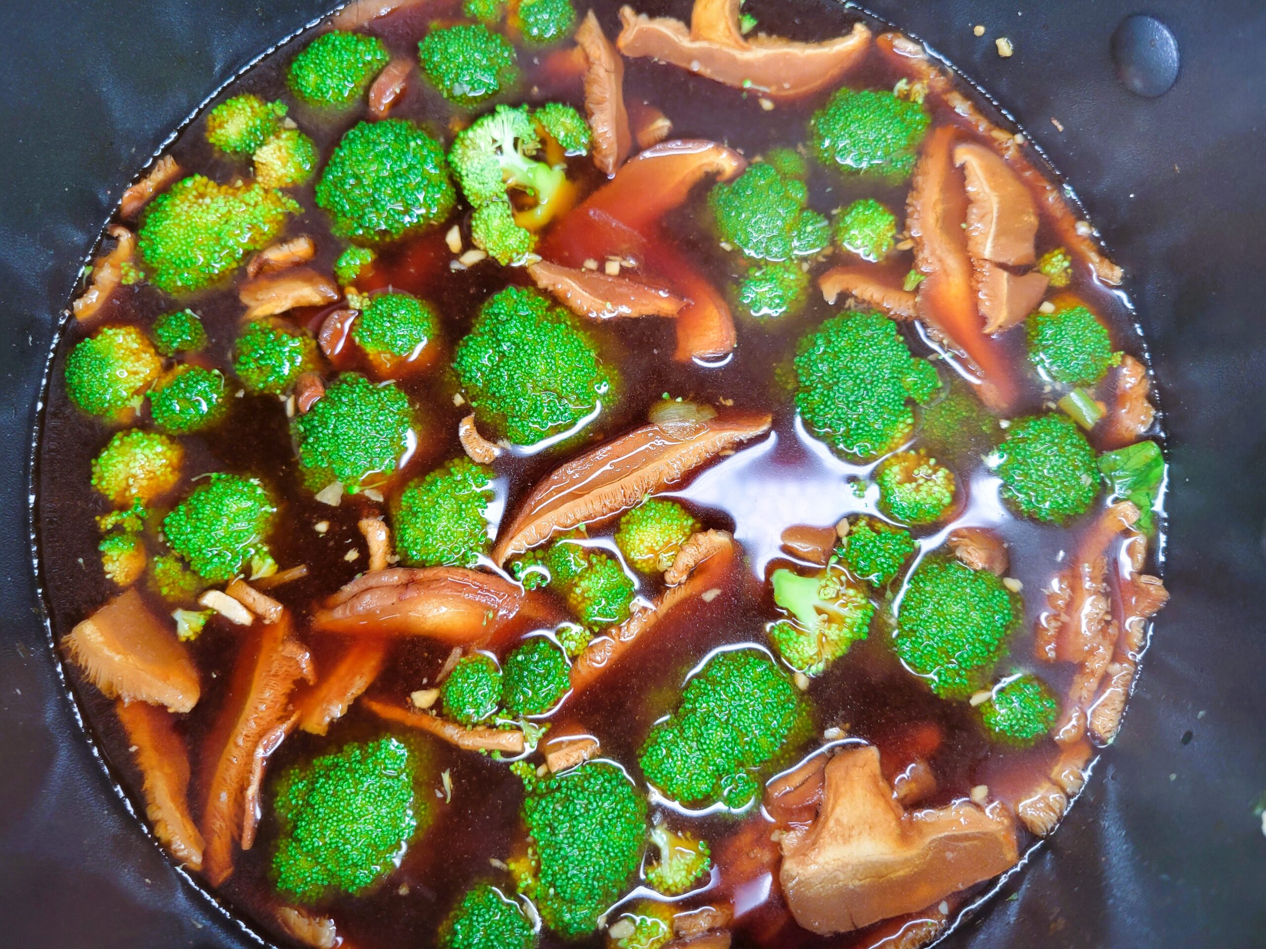 In the same pot add remaining garlic and 1 teaspoon peeled and grated ginger sauteing for a minute then add 6 cups of vegetable broth. Add to the broth 1 tablespoon of the following: miso paste, oyster sauce, lite soy sauce and dark soy sauce. Heat to a simmer. Cut the head of broccoli into florets and add them to the broth. Add sliced shiitake mushrooms to the broth. I used dehydrated Shiitake Mushrooms that I ordered from Amazon.