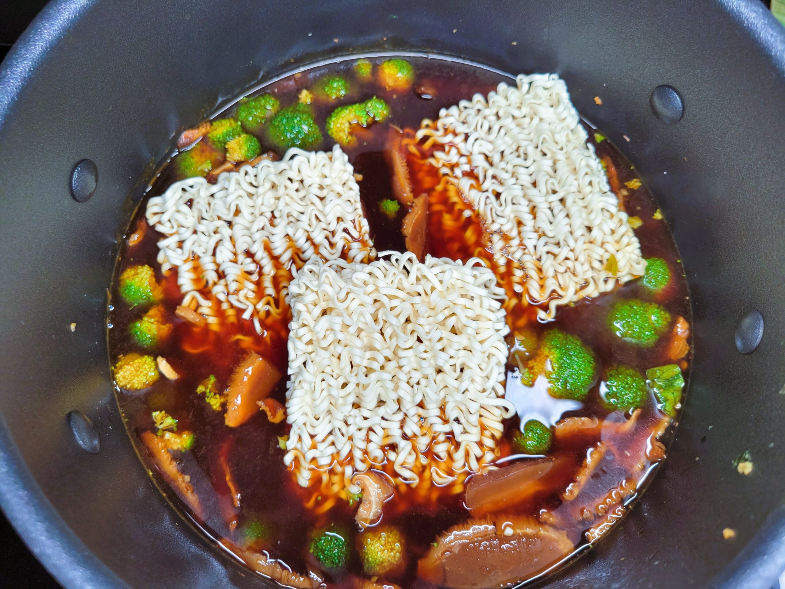 Add noodles to the broth and allow to cook. I love Wok Noodle Original noodles, they have great texture. I purchased the noodles from Amazon, you can also use the Top Ramen brand and remove the seasoning packet, just using the noodles.