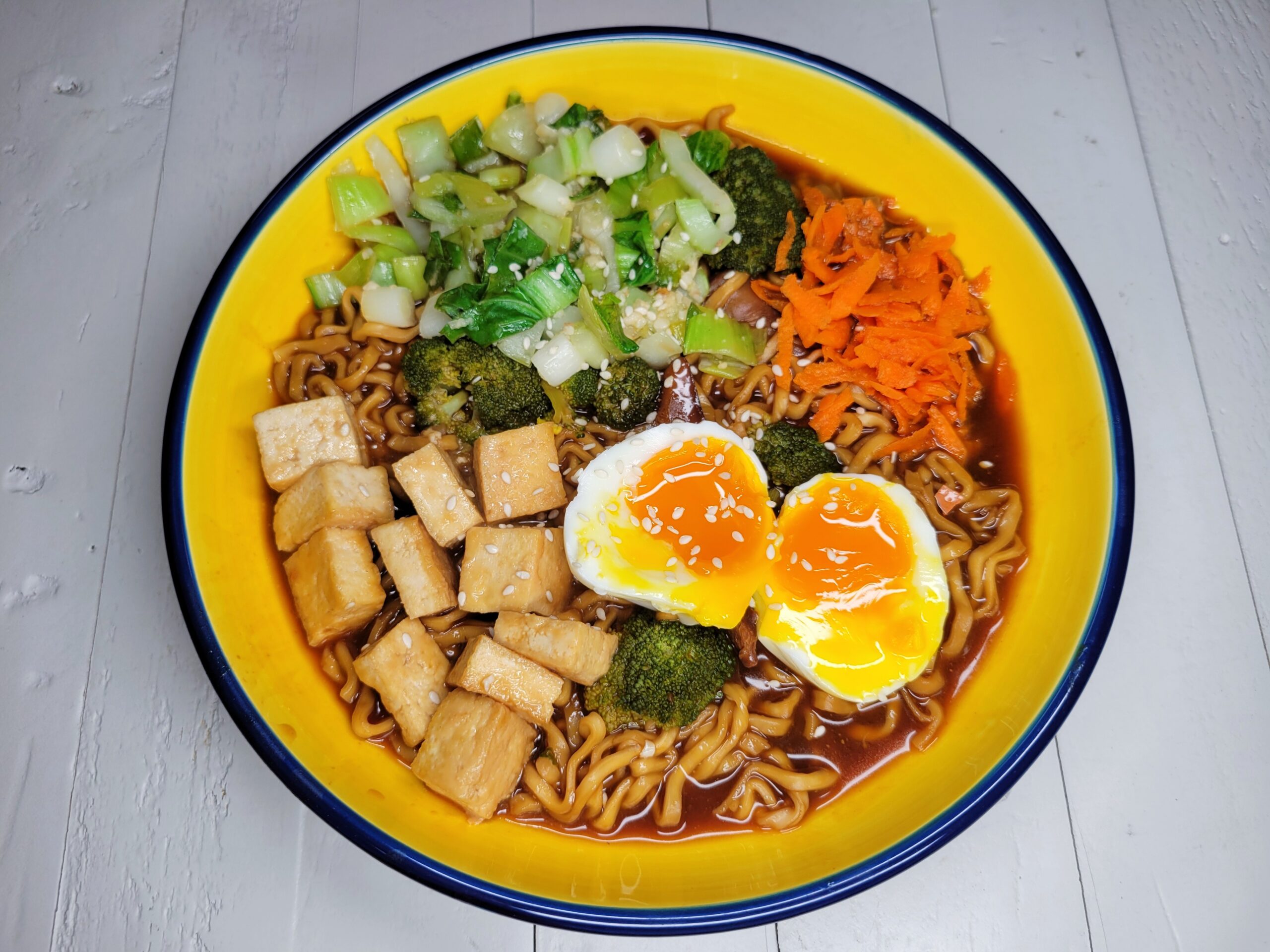 Assemble ramen. Add a generous amount of noodles, broccoli, mushrooms and broth to a bowl. Next add in sautéed Bok choy, grated carrots and fried tofu. Peel the eggs, gently slice them in half and place them on top of the ramen. Sprinkle with sesame seeds. Enjoy!