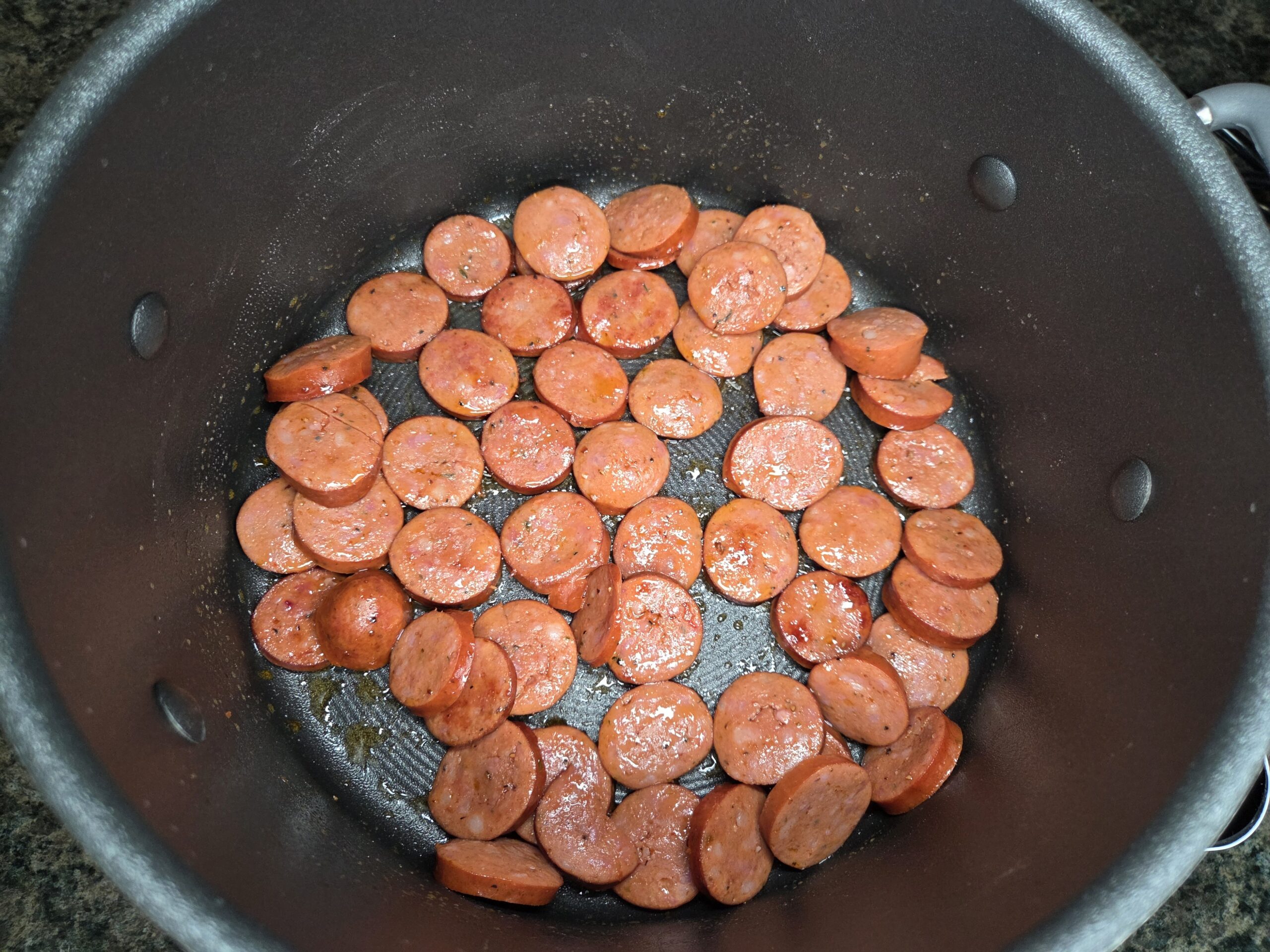 Heat a tablespoon of olive oil or butter in a pot over medium-high heat. Brown the andouille sausage, then remove from the pot, leaving all the drippings behind.