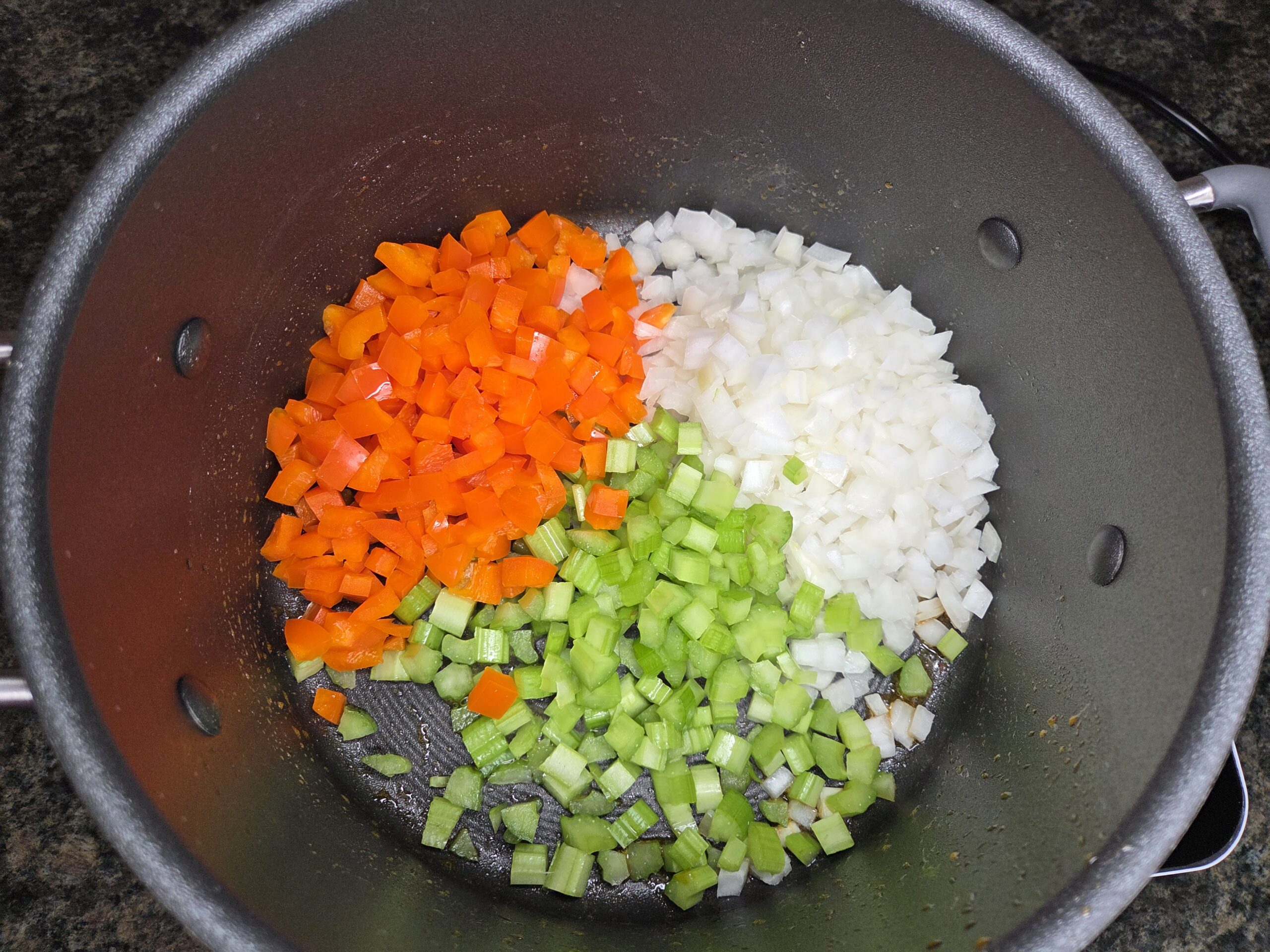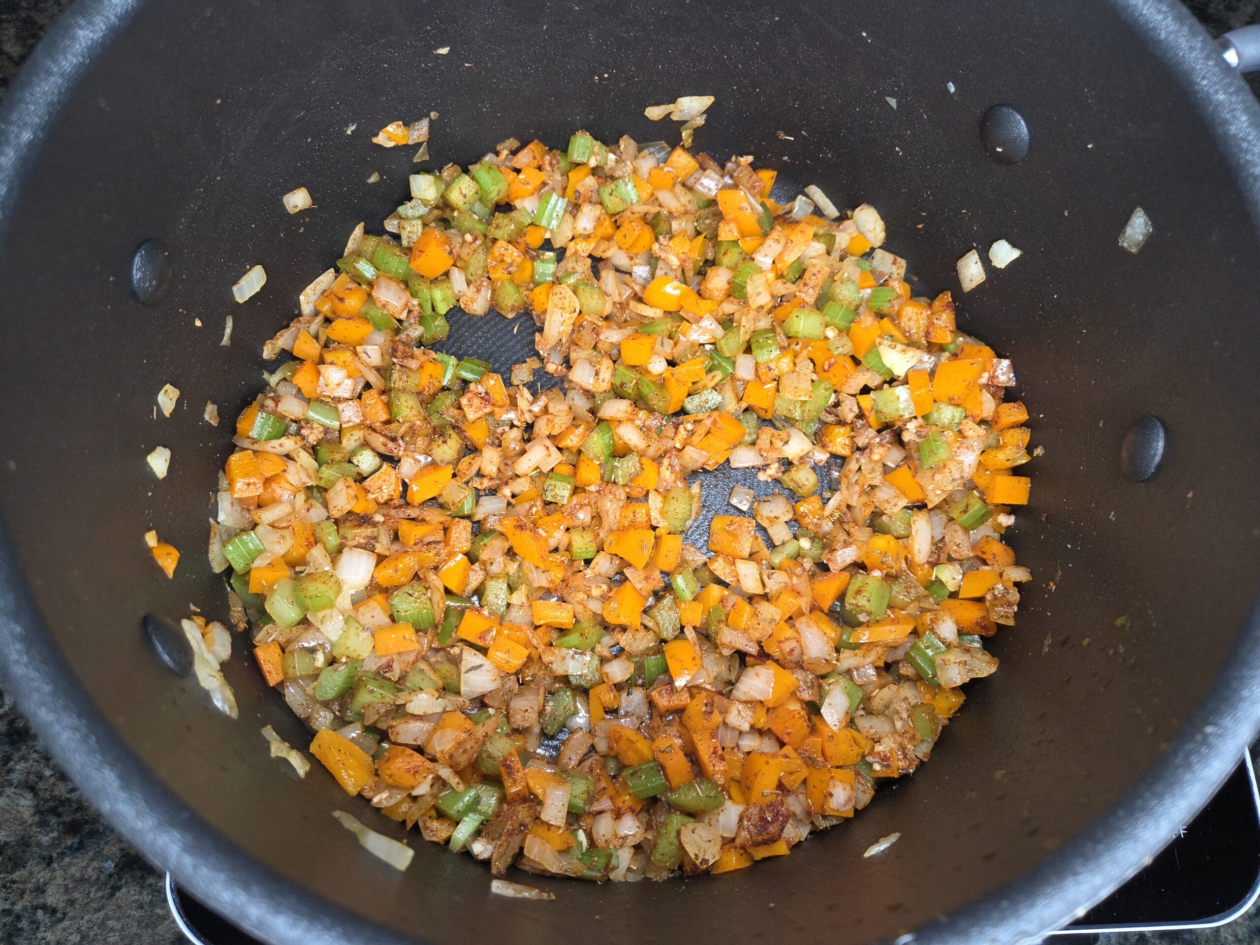Add diced celery, bell peppers, and onion to the pot with the drippings, cooking until softened, about 7 minutes.