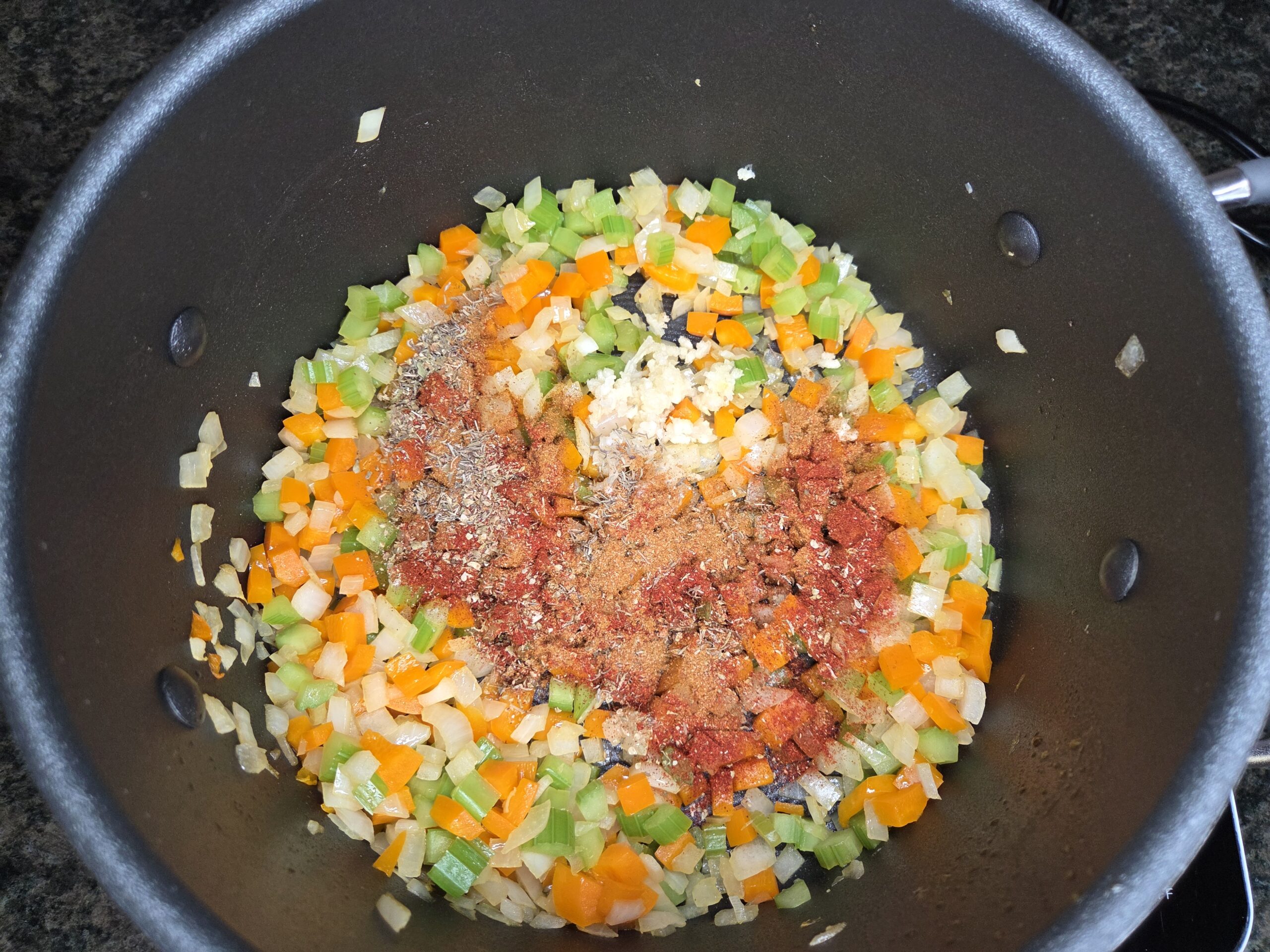 Add 3-4 minced garlic cloves to the pot, then stir in 1 teaspoon each of smoked paprika, dried thyme leaves, and dried oregano, along with 1/2 to 1 teaspoon of Cajun seasoning and 1 bay leaf. Cook just until the spices become fragrant, about a minute or two.