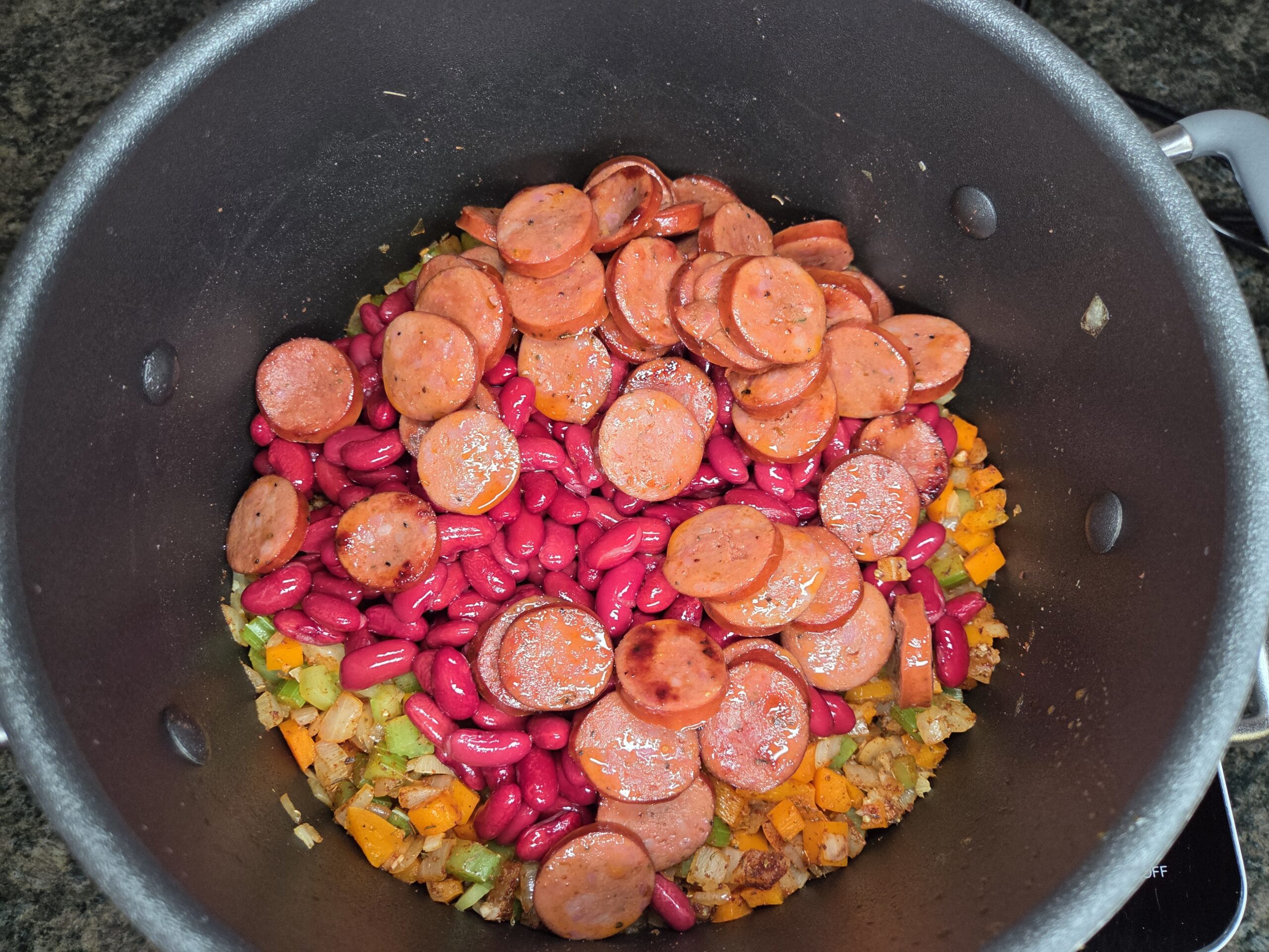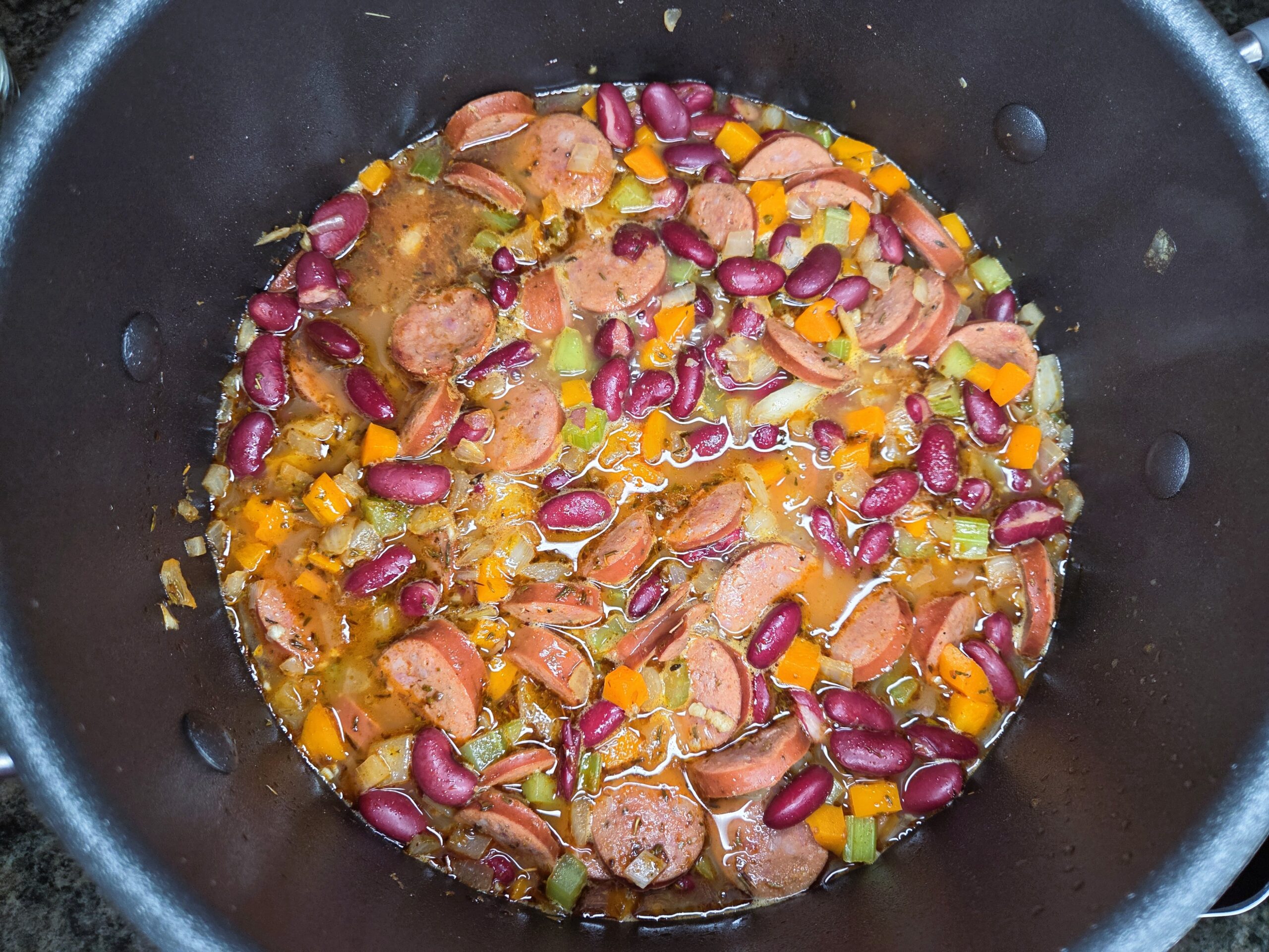 Add the 2 cans of drained red kidney beans to the pot, then return the andouille sausage to the mixture, and add 2 cups of chicken broth, stirring everything together until well combined.