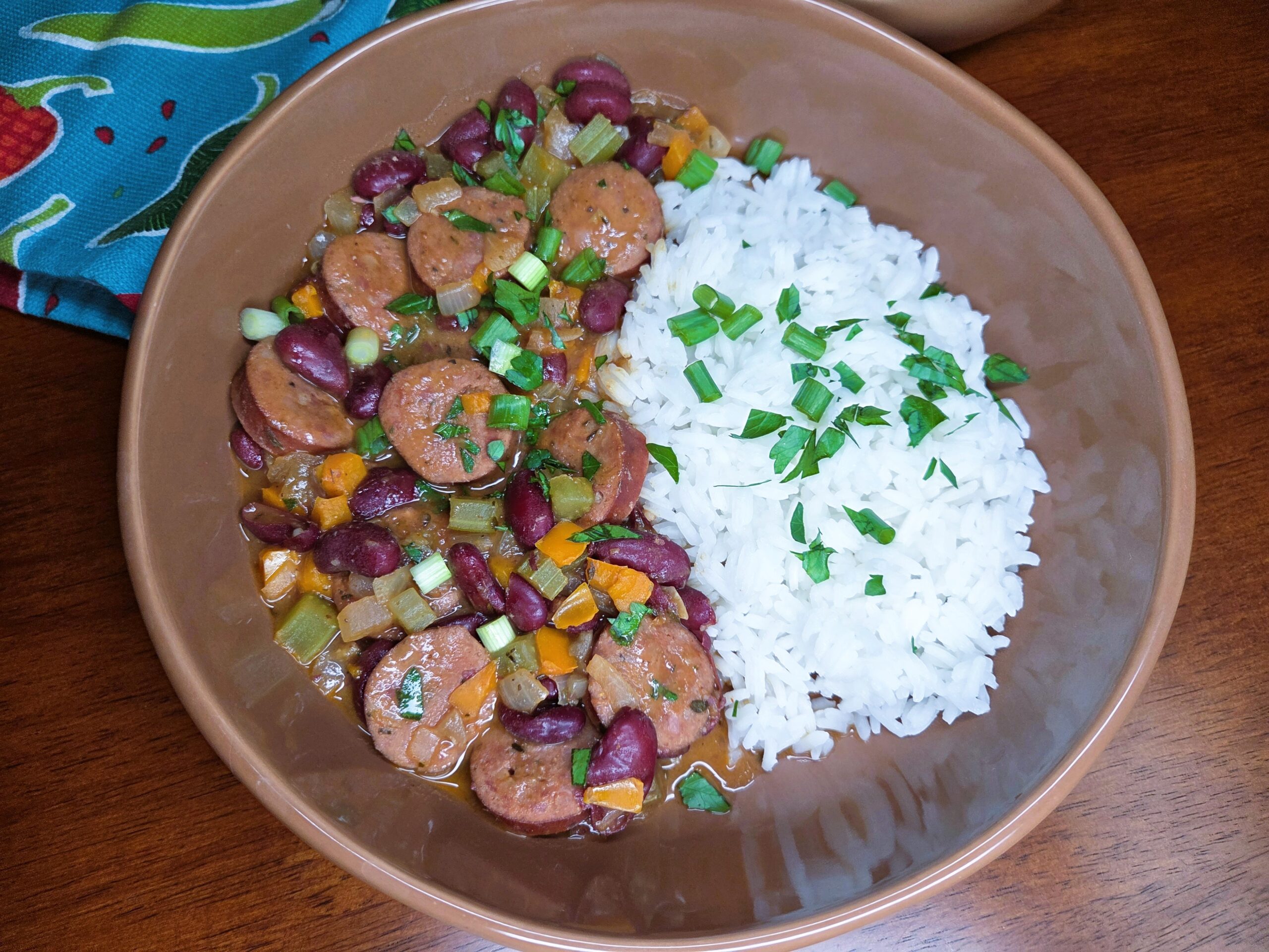 Creamy Red Beans and Rice with bell pepper, onion, celery, and spices simmered with andouille sausage.