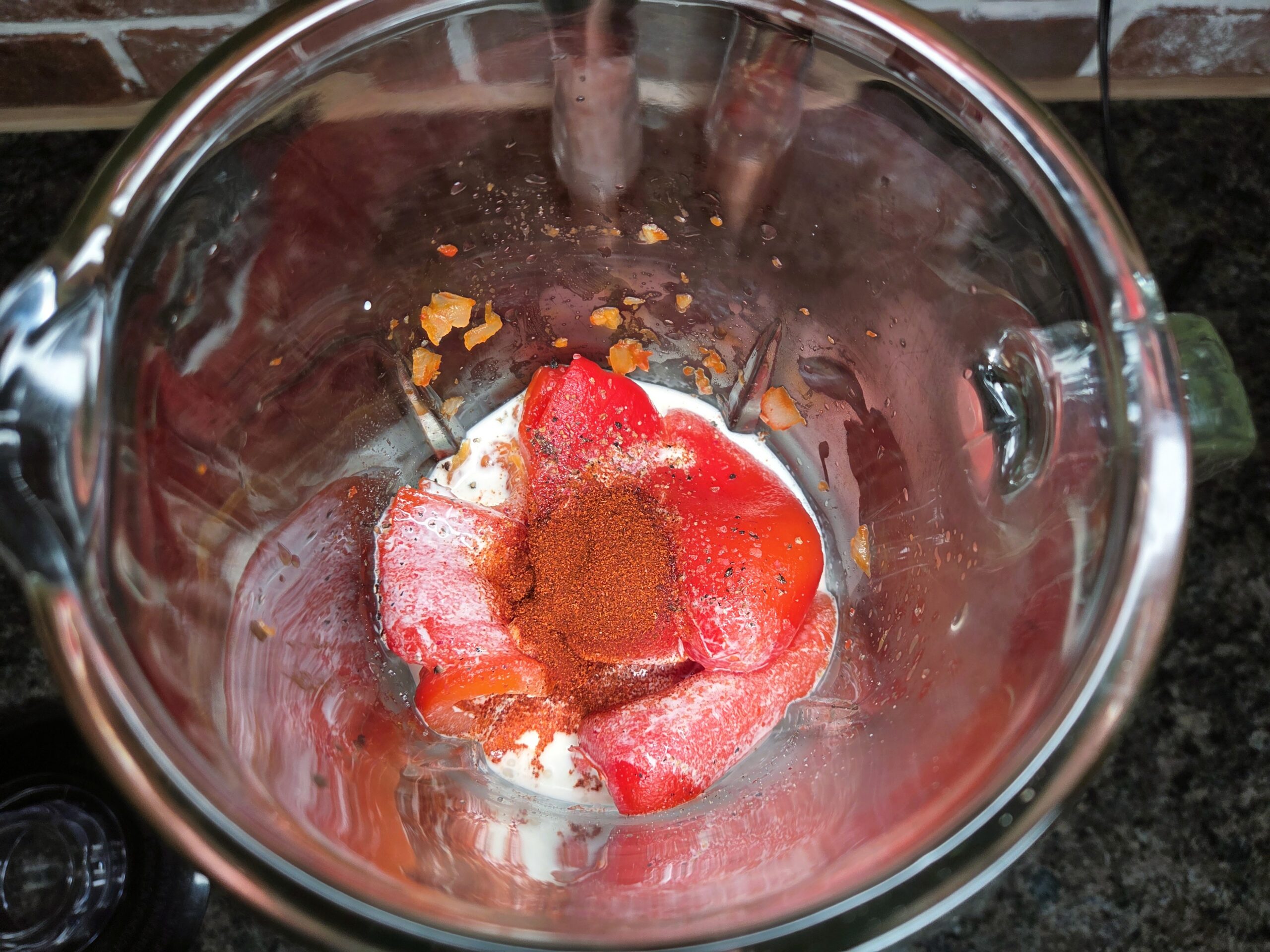 Place the sauteed onions and cleaned red peppers into a blender. Then add 1/2 teaspoon of smoked paprika, salt, and pepper to taste; 1/4 cup of Parmesan cheese, if using; and 1/2 cup of heavy cream or full-fat coconut milk. Blend on high until completely smooth.