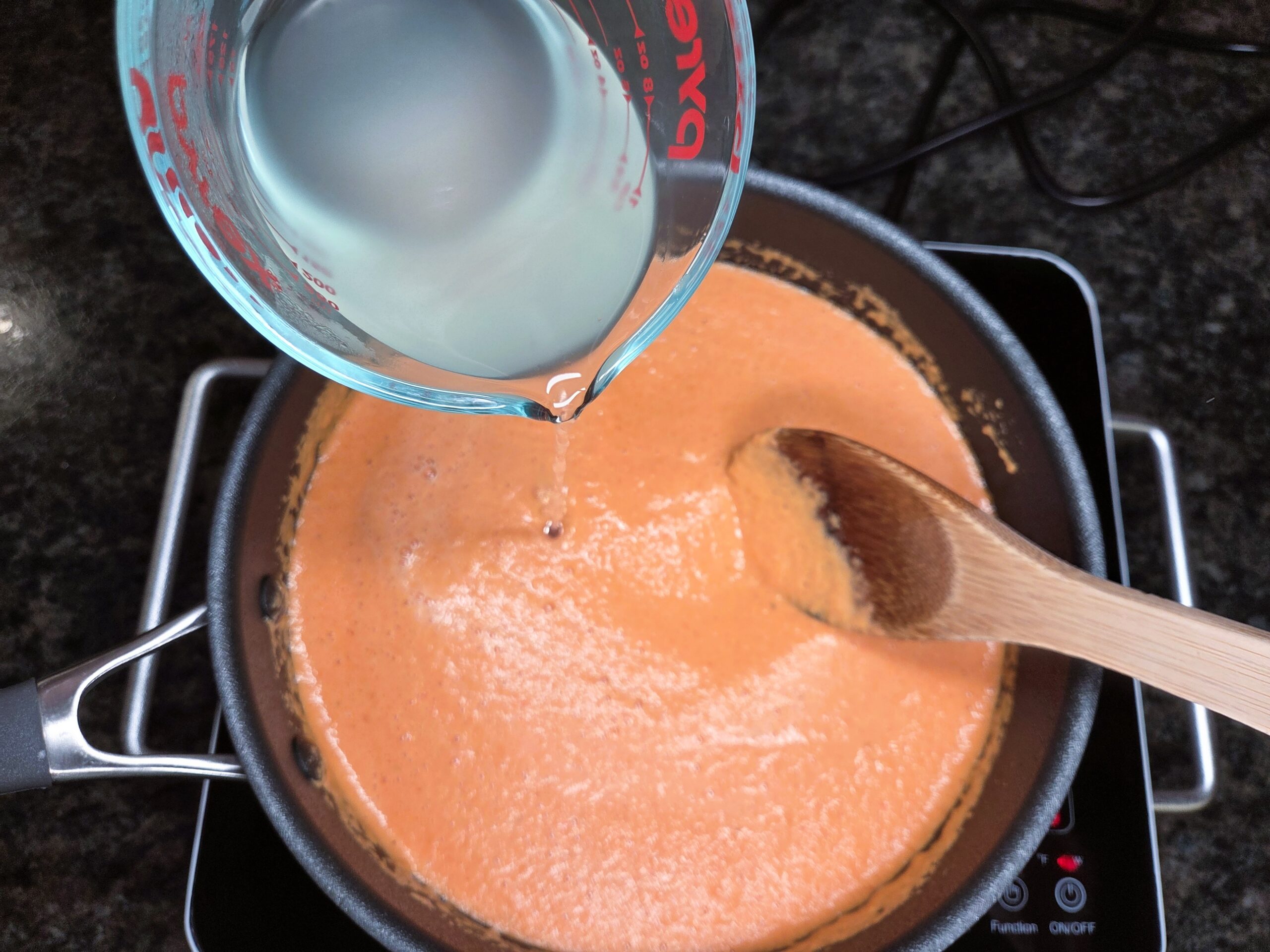 Add reserved pasta water to the sauce a little at a time, thinning it to the desired consistency.