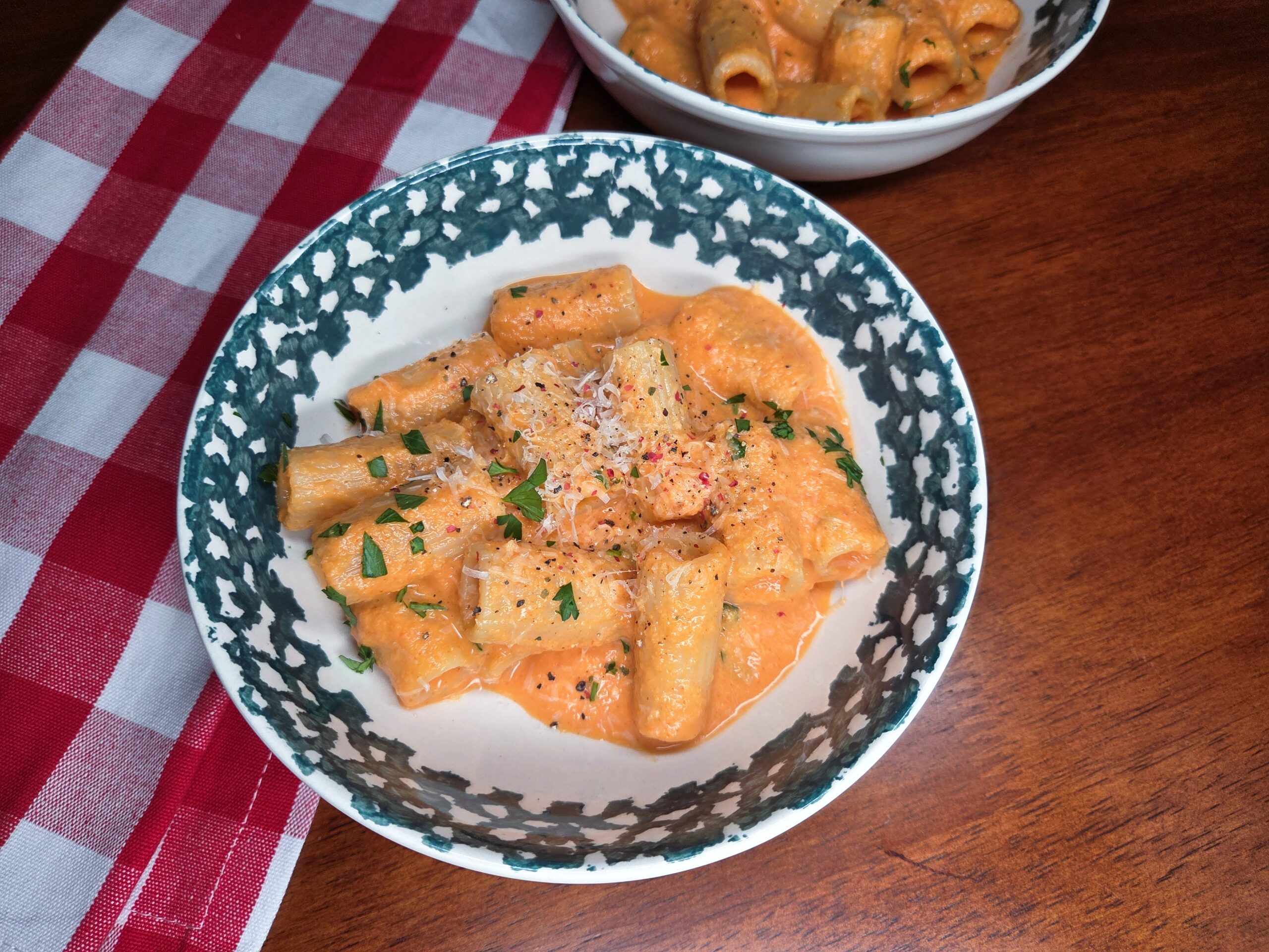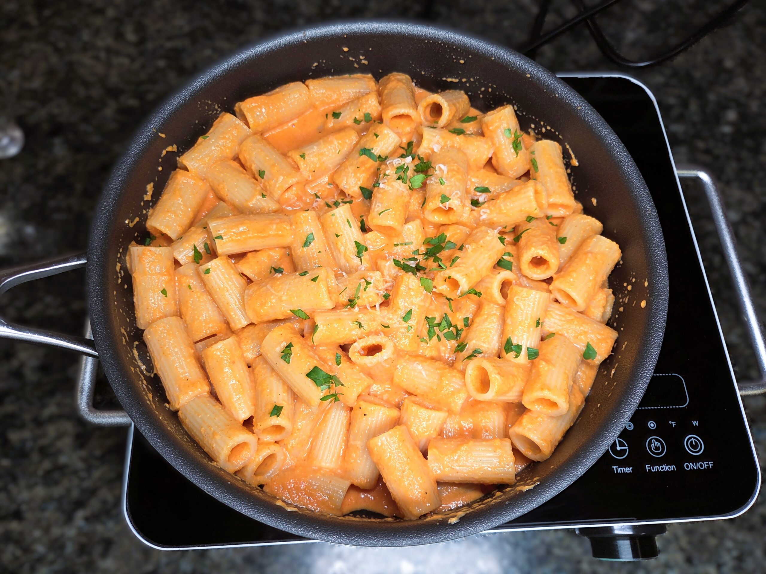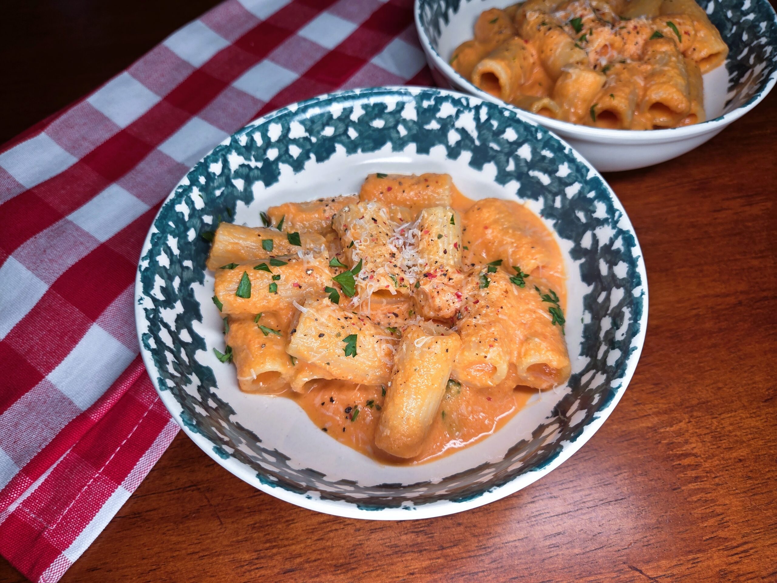 This delicious, easy sauce starts with roasted red bell peppers, softened onions, and plenty of garlic sautéed in olive oil until everything turns sweet and fragrant. Blended with heavy cream or coconut milk, tomato paste, and a touch of smoked paprika, it becomes a silky, sunset‑colored sauce that clings beautifully to rigatoni or any pasta you love. A sprinkle of Parmesan adds richness, while salt, pepper, and fresh parsley brighten the whole dish.