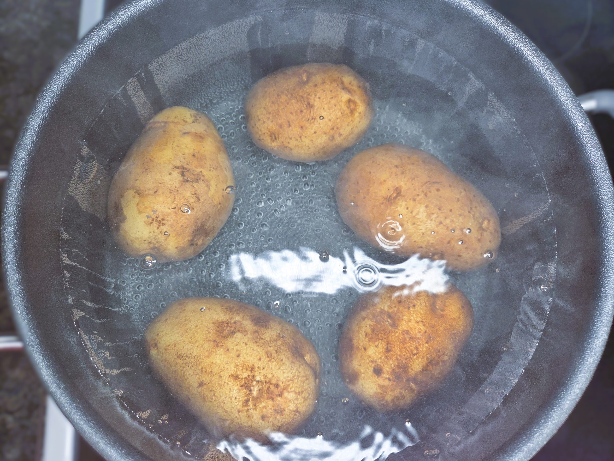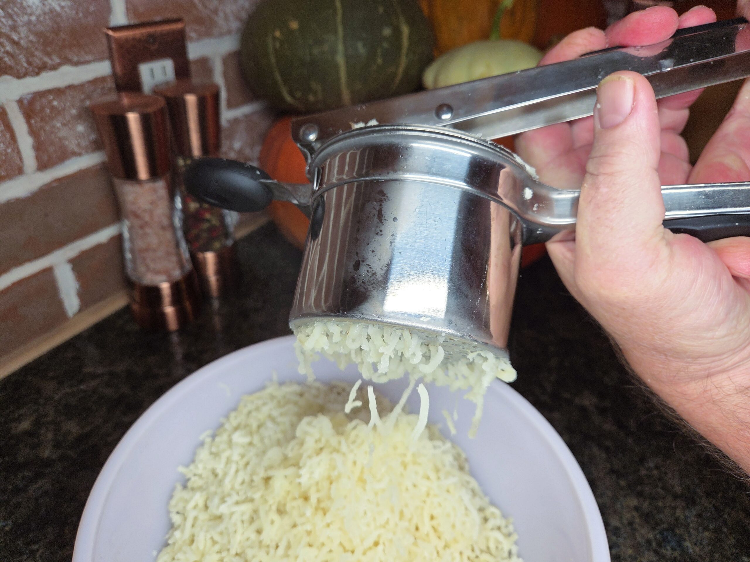 Peel and boil 2 pounds of potatoes until fork-tender. If you're using a potato ricer, you can skip peeling; simply press the cooked potatoes through, and the skins will stay behind.