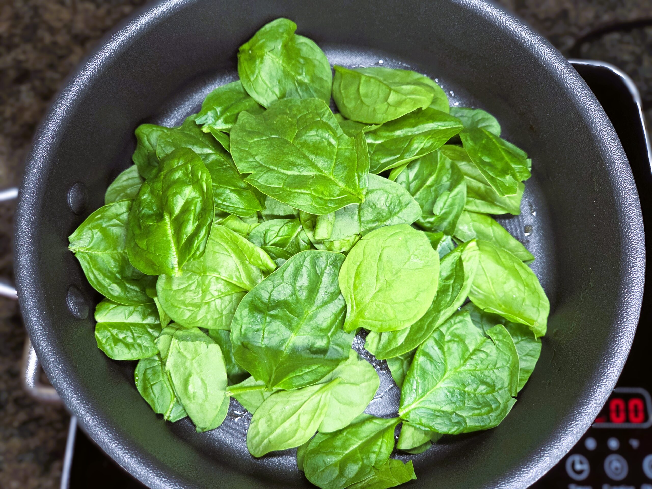 While the potatoes cook, remove any long stems from the spinach leaves. Heat 1/2 tablespoon of olive oil in a medium skillet, sauté 2 cups of spinach until wilted, and set aside.