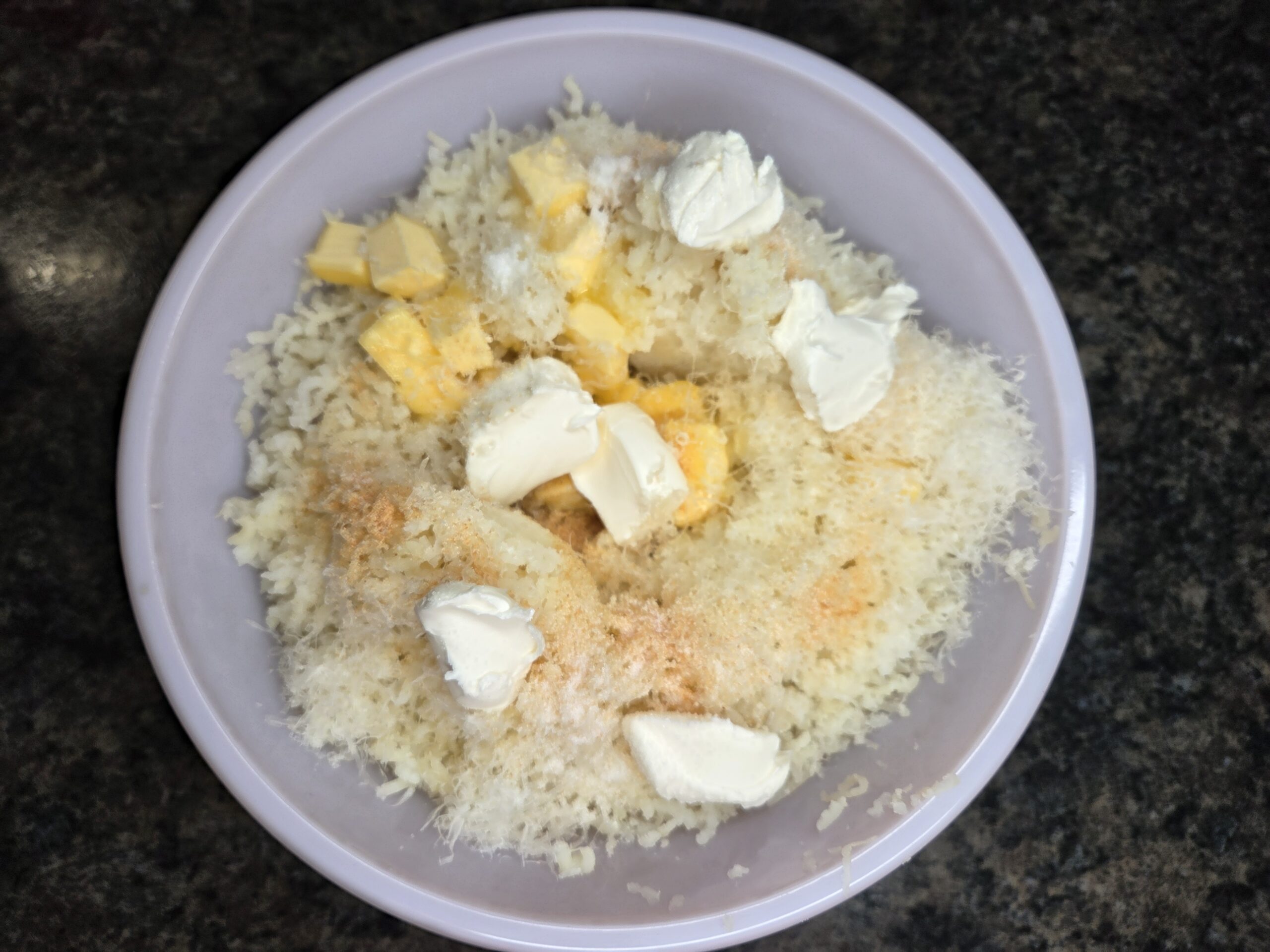 Add to the potatoes 4 tablespoons of softened butter, 2 ounces of softened cream cheese, ½ cup of heavy cream, ¼ cup of grated Parmesan cheese, ½ teaspoon of salt, and ½ teaspoon of garlic powder. Blend gently by hand or with an electric mixer on low speed until fully incorporated and whipped. Be careful not to overmix, as excessive stirring can activate the starch and result in a gluey texture.
