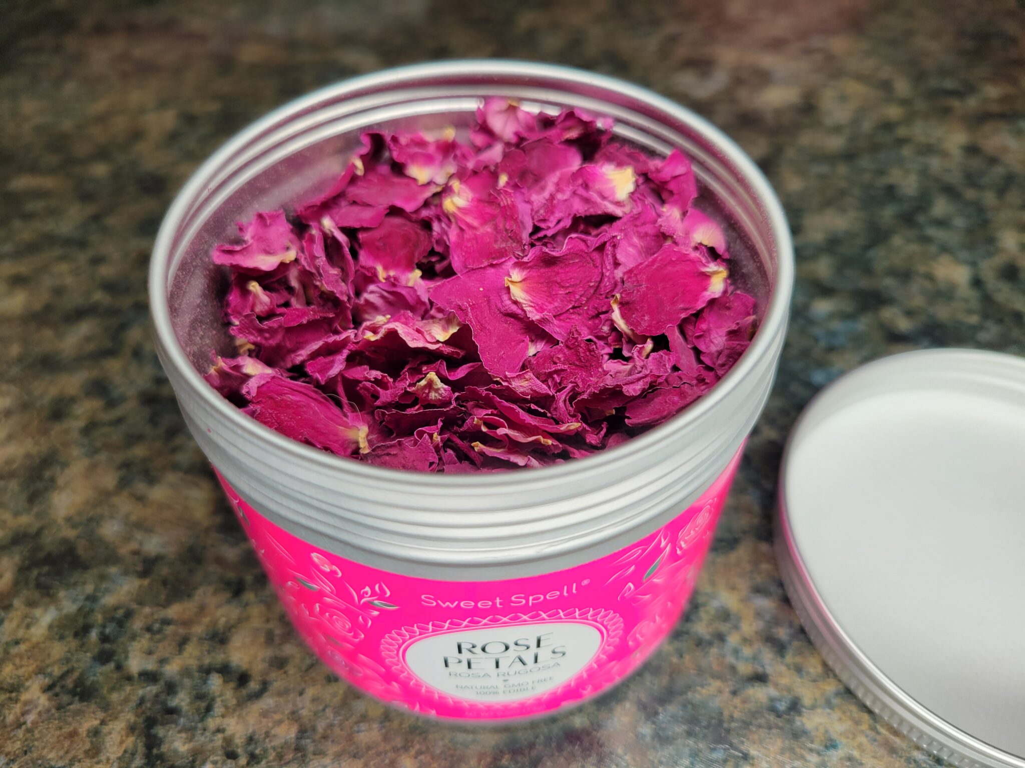 When the cake is completely cool, spread a layer of the whipped cream frosting over the top. Finish by sprinkling the edible rose petals evenly across the surface.