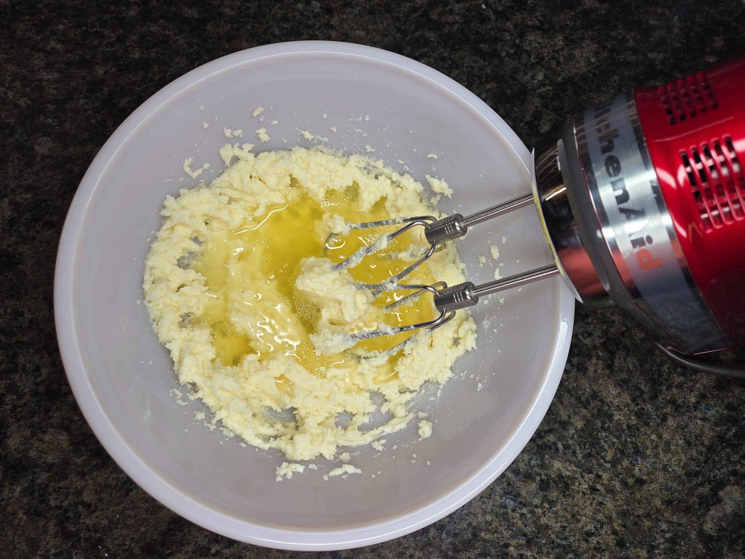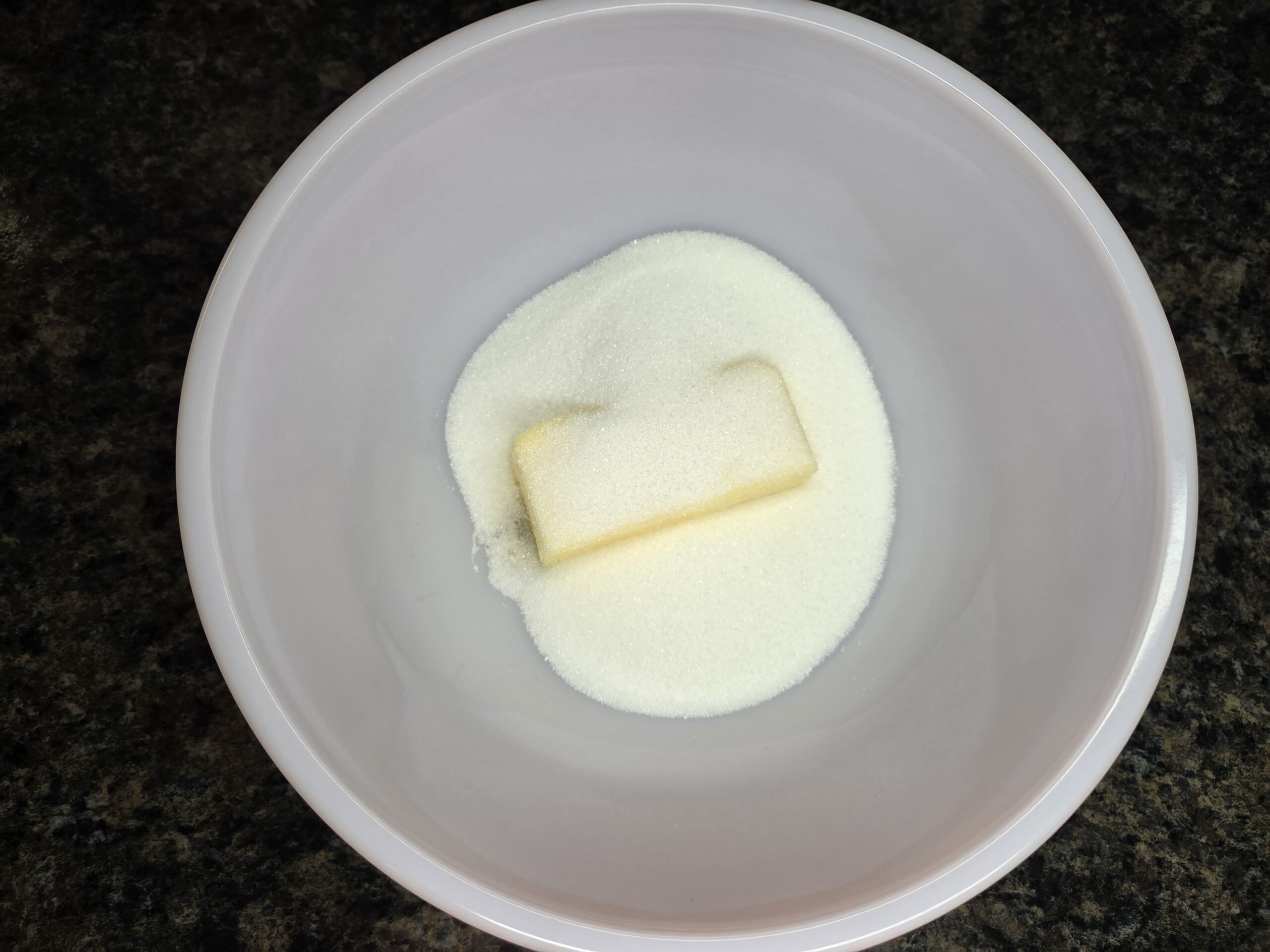 In a large bowl, beat together 1/2 cup softened unsalted butter and 2/3 cup granulated sugar until the mixture is pale yellow and fluffy.
