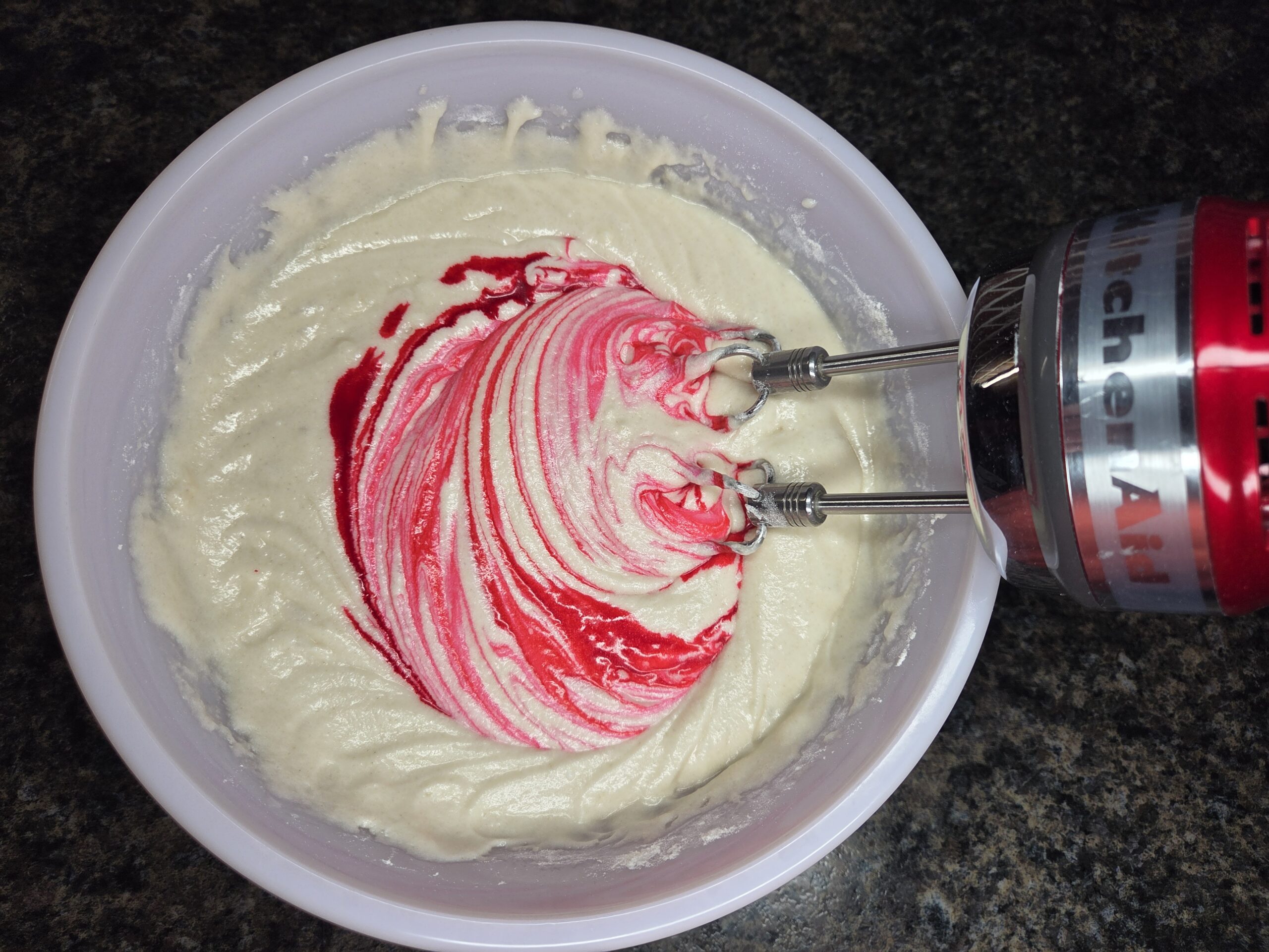 Add the pink food coloring to the cake batter and mix just until the color is evenly combined. I used 3/4 teaspoon of liquid pink food coloring in the photos, but you can adjust the amount to reach your preferred shade.
