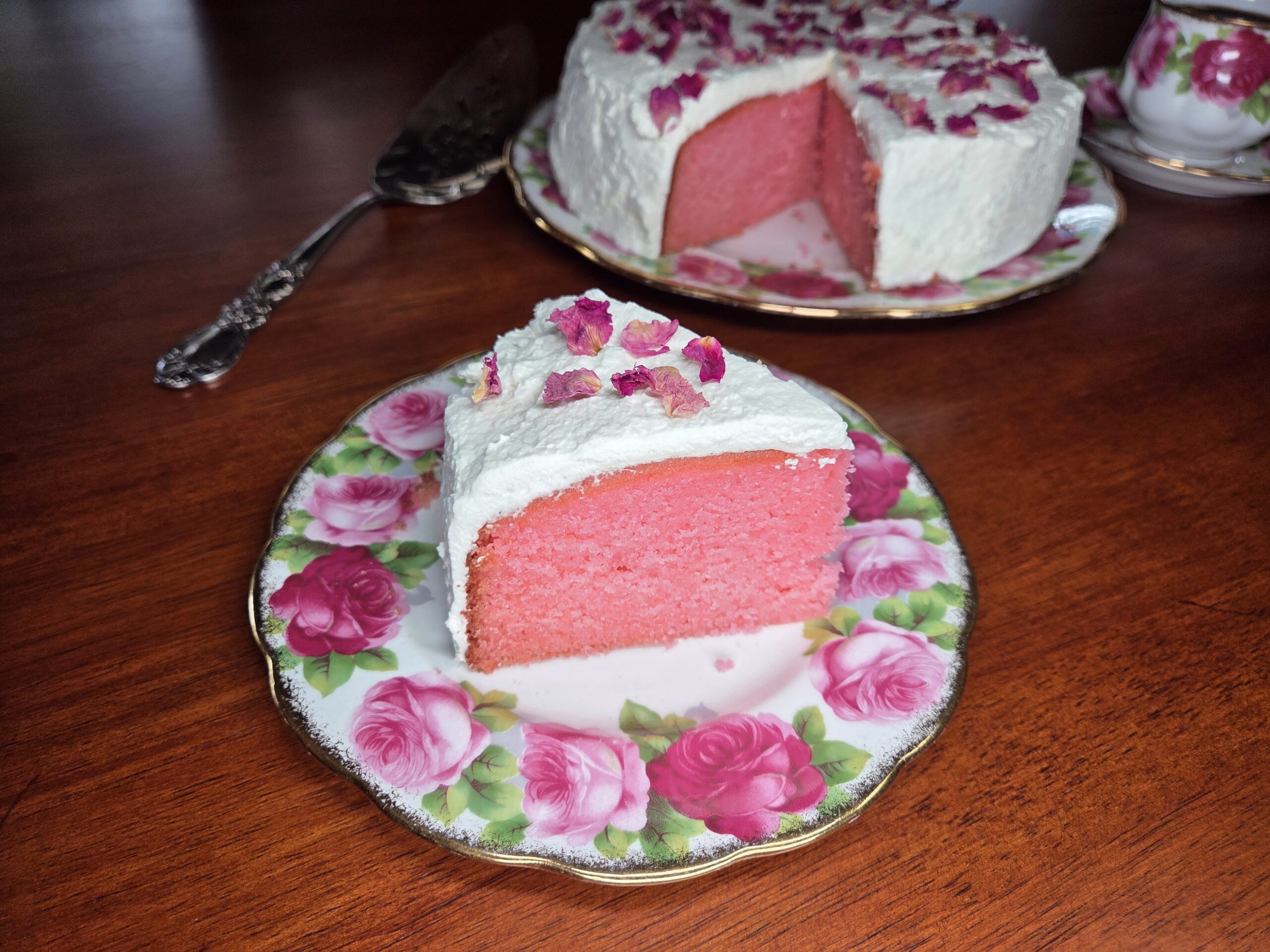 Delicious moist rose milk cake with whipped cream frosting, topped with edible rose petals.