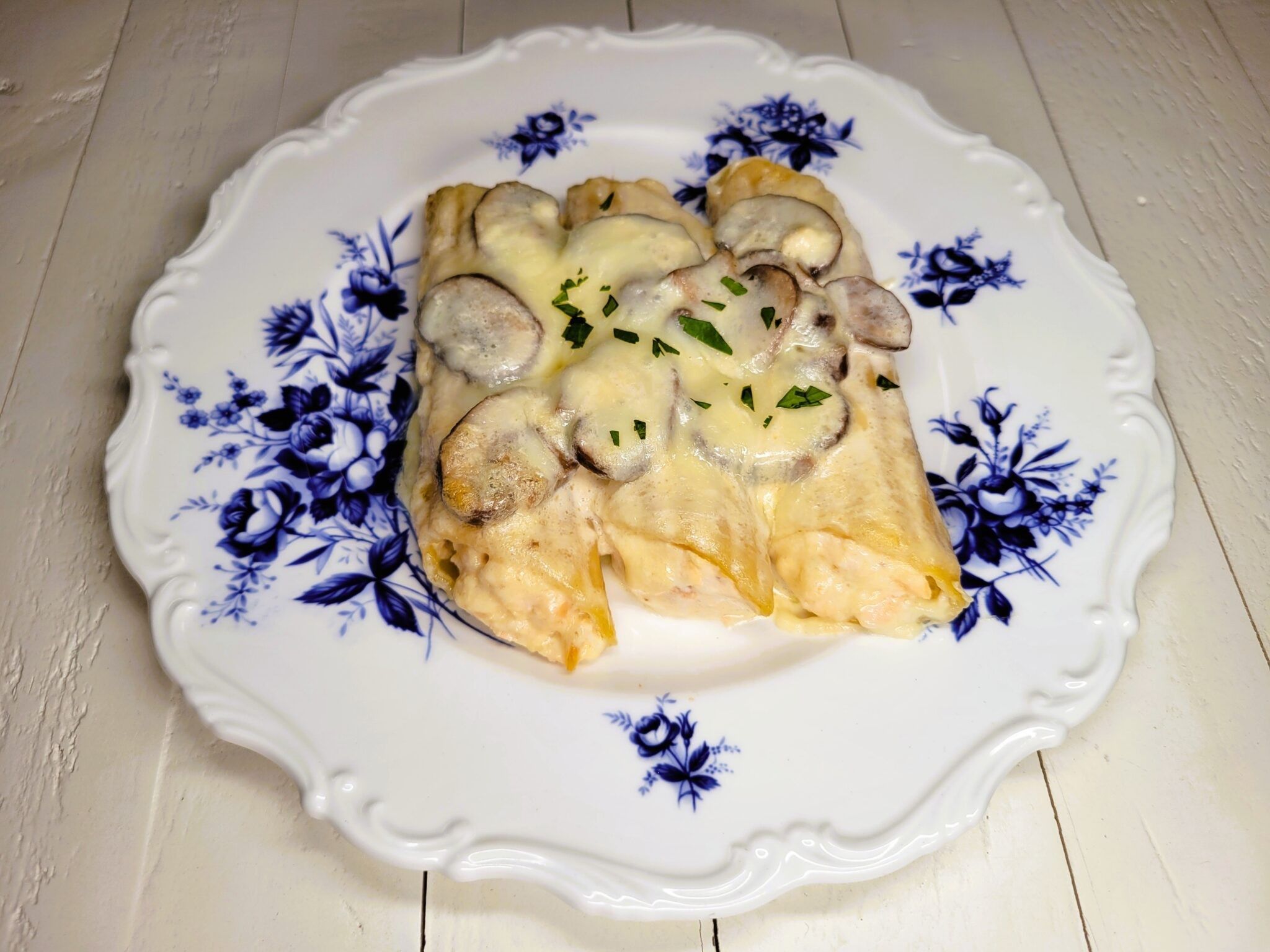Salmon Stuffed Manicotti with Mushroom Cream Sauce