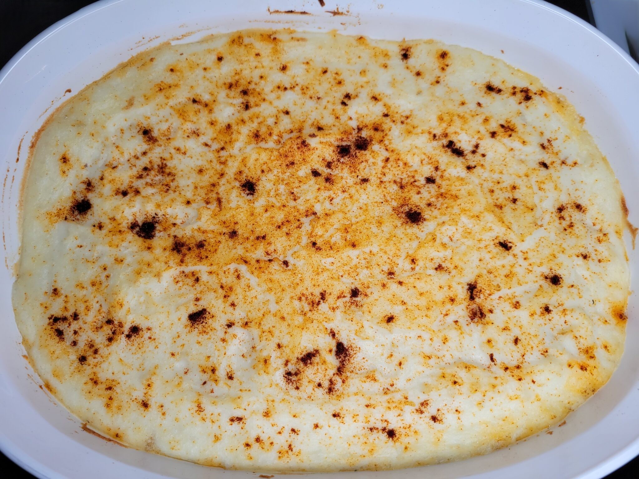 Spread the mashed potatoes evenly over the meat and vegetable filling, smoothing them to the edges of the dish. Sprinkle the top with smoked paprika for a subtle smoky flavor and a pop of color. Bake in the preheated oven at 375°F for 20–25 minutes, or until the top is golden and lightly crisp.