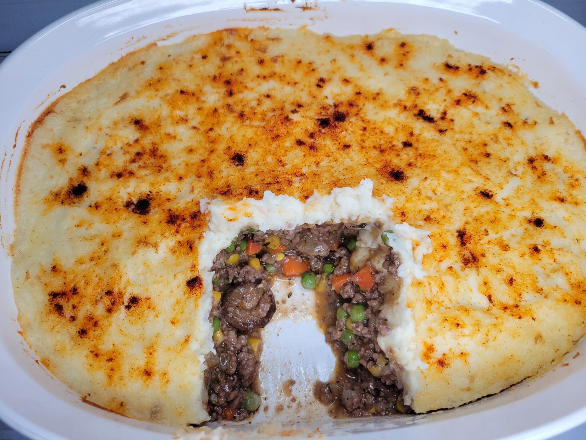 A savory wonderful dish! Ground beef, red wine, carrots, peas, onions, corn and mushrooms covered in a layer of buttery cream cheese potatoes with smoked paprika garnish.