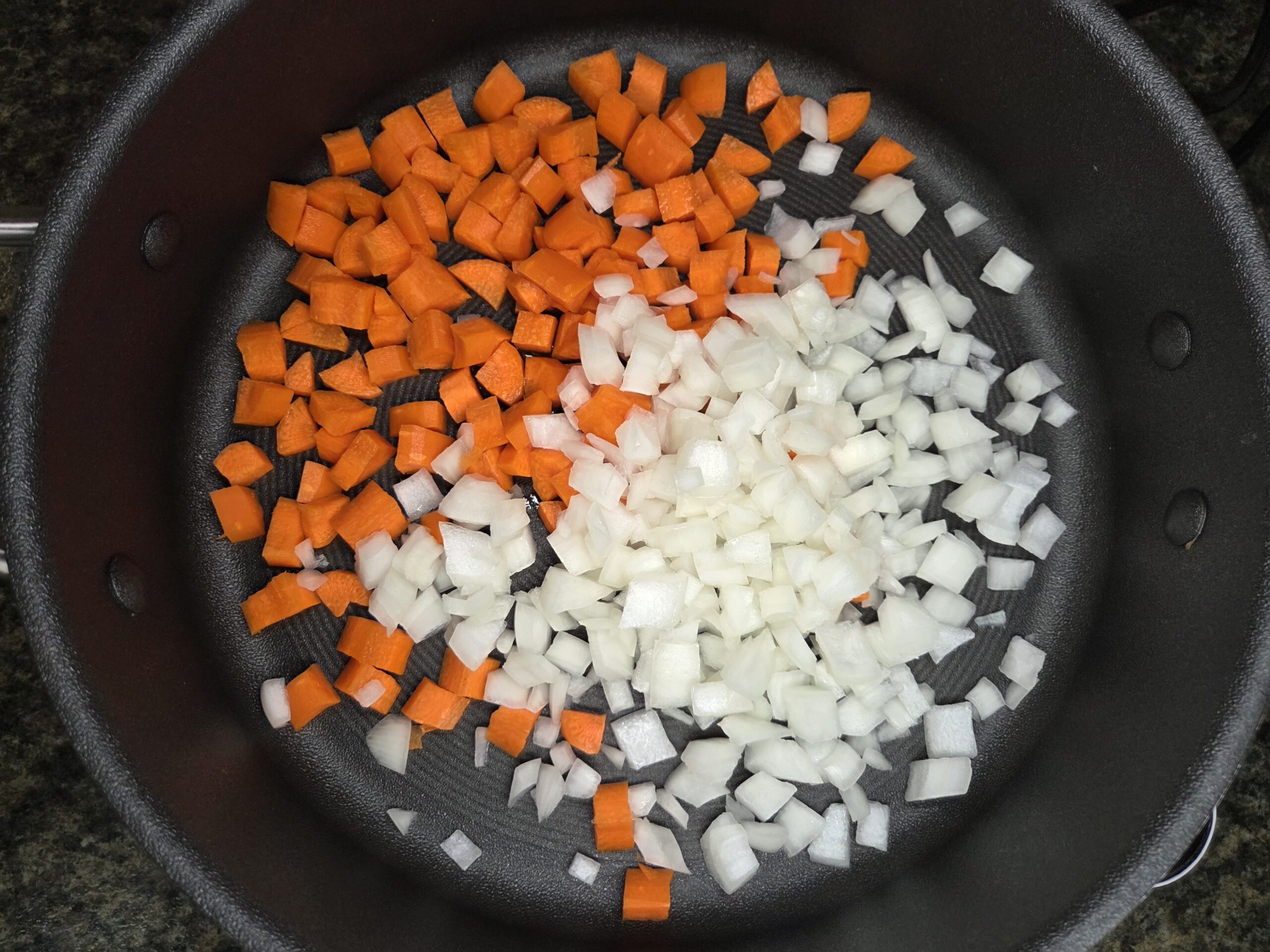 While the potatoes boil, heat a tablespoon of vegetable oil in a large skillet over medium heat. Toss in 1 cup of diced carrots and 1 1/4 cups of diced onions, and sauté for 7-8 minutes, or until the carrots begin to soften.