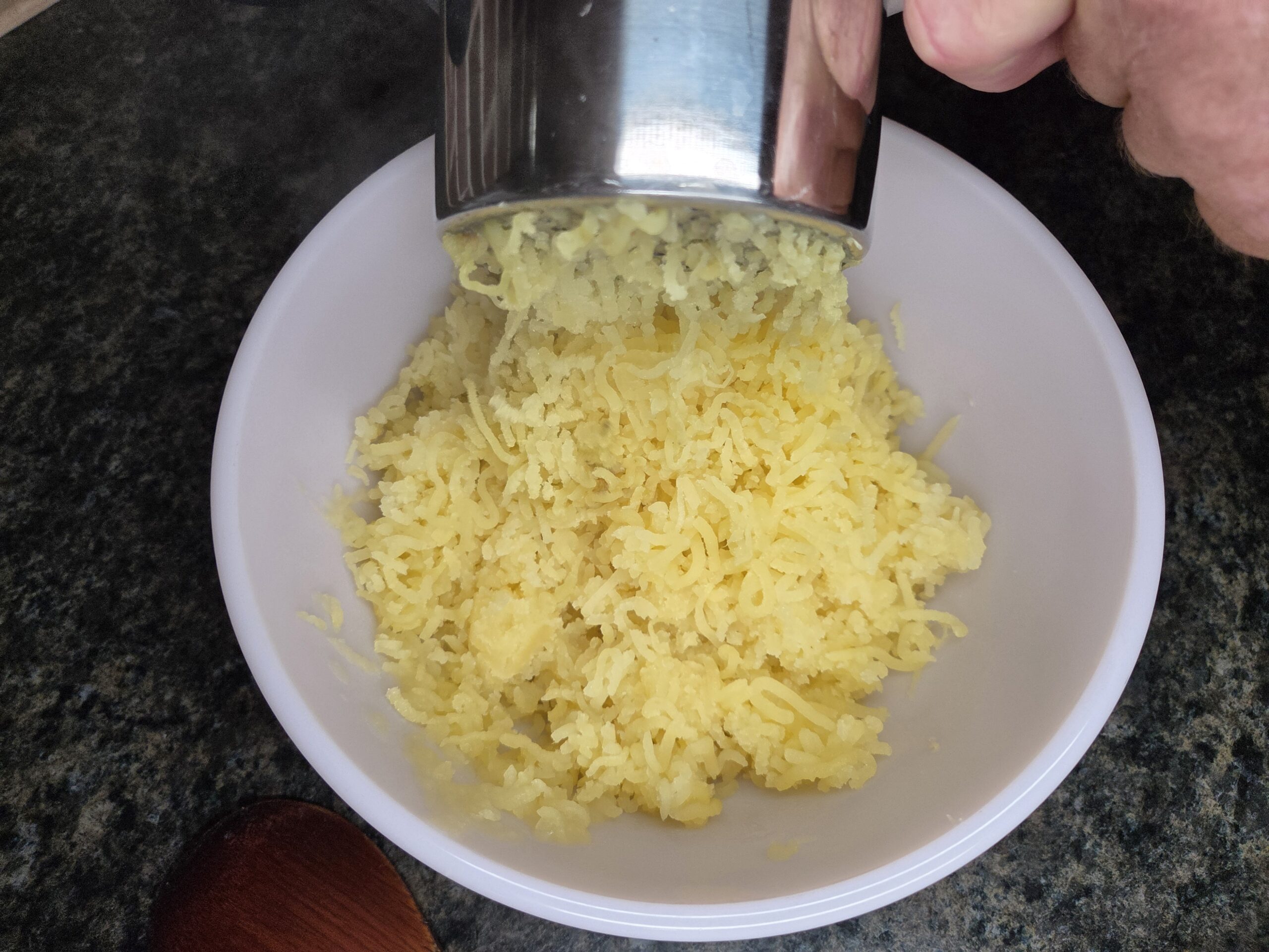 Peel and boil 3 pounds of potatoes in salted water until fork-tender. I'm using Yukon Gold potatoes in the photos. If you're using a potato ricer, you can skip peeling; simply press the cooked potatoes through, and the skins will stay behind.