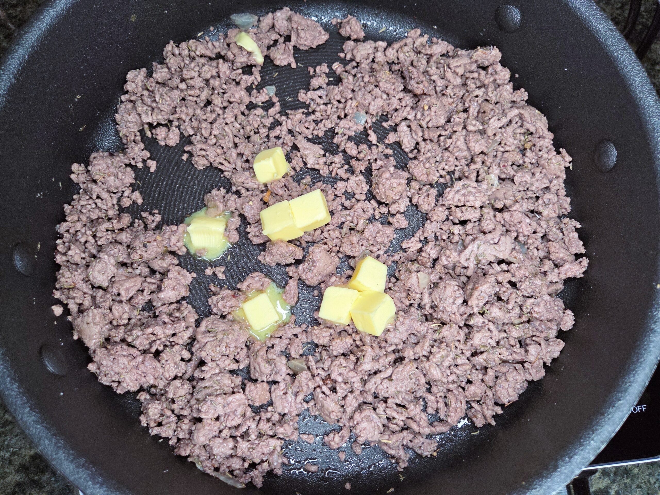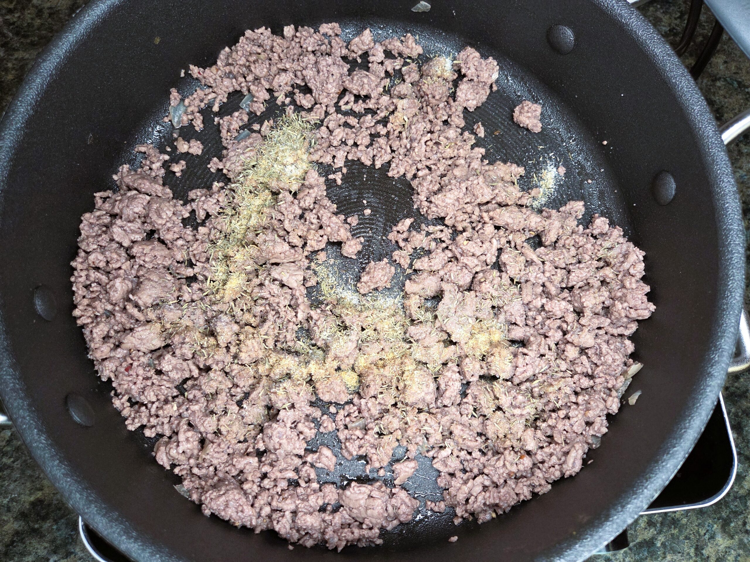 In the same skillet, add 1 pound of ground beef and cook over medium heat until it’s no longer pink, breaking it up with a spoon as it cooks. Drain off any excess grease.