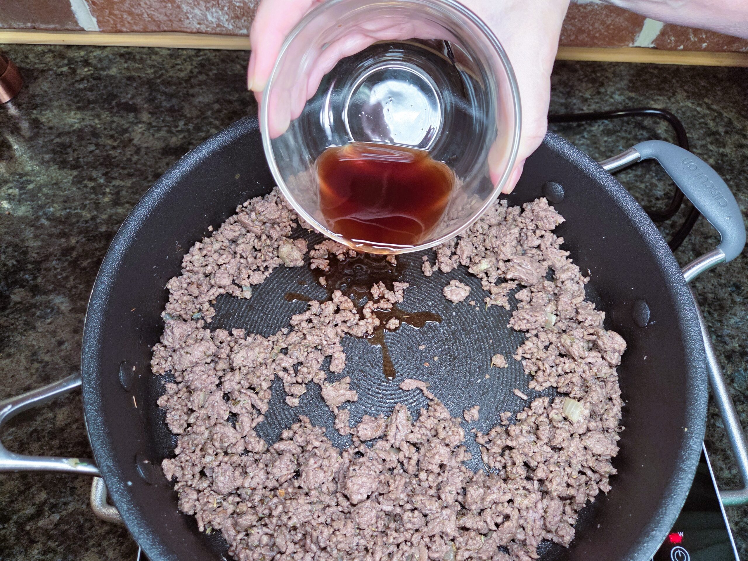 Pour in ⅛ cup of red wine and stir, scraping up any browned bits from the bottom of the skillet. Let it cook for 2–3 minutes, allowing the alcohol to evaporate and the wine to reduce. This step deepens the flavor of the filling and ties together the savory beef and aromatic vegetables.