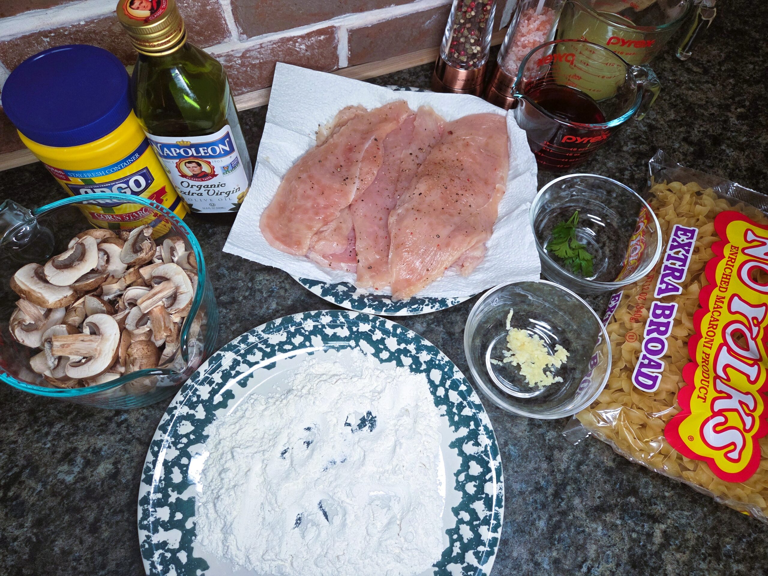 Prepare ingredients. Slice the chicken breasts in half lengthwise into thin cutlets and use a kitchen mallet to gently pound them to about a ¼‑inch thickness so they cook evenly. Then pat them dry. Season both sides with salt and pepper, then slice 8 ounces of crimini mushrooms and mince 3 cloves of garlic.