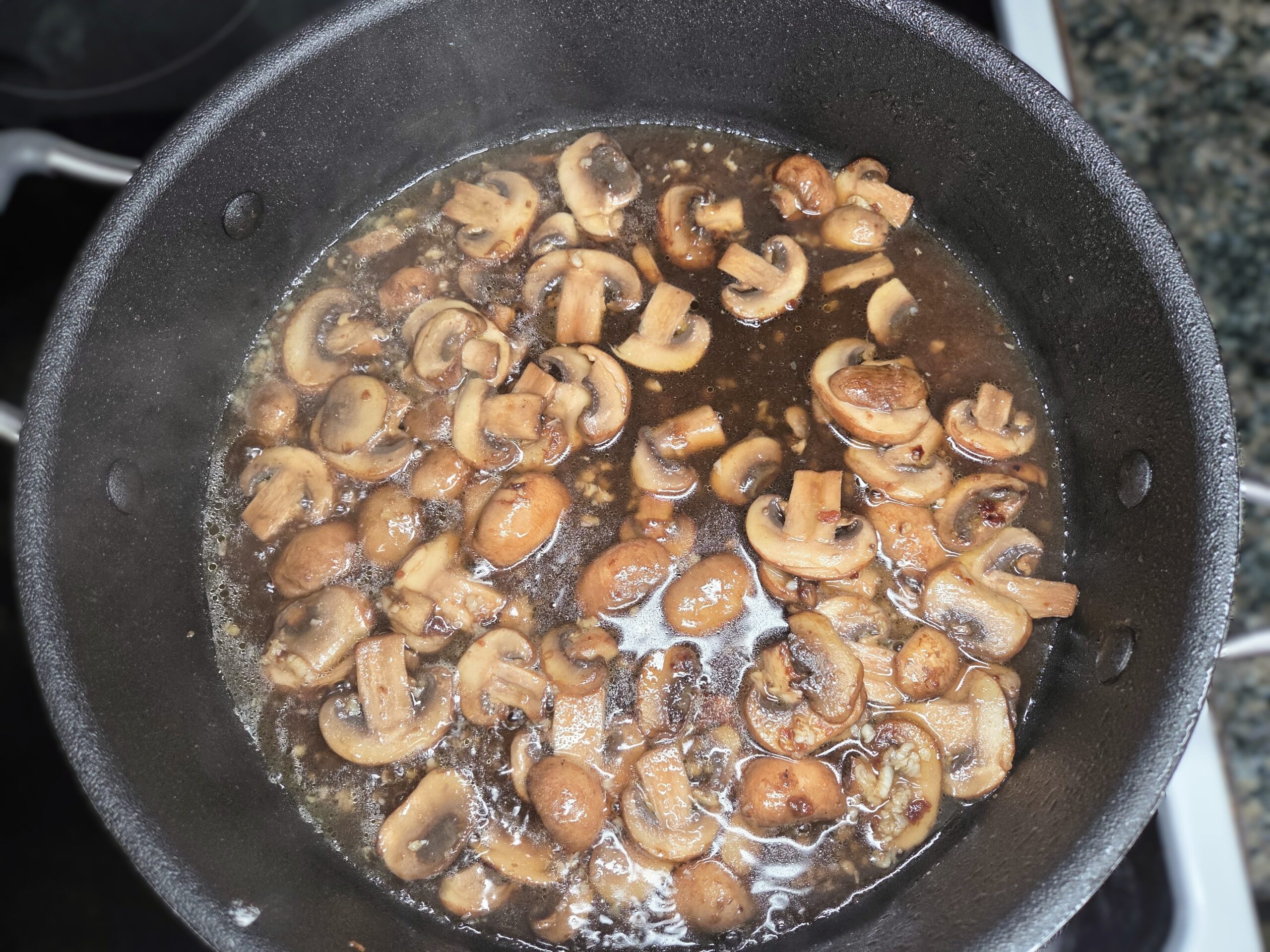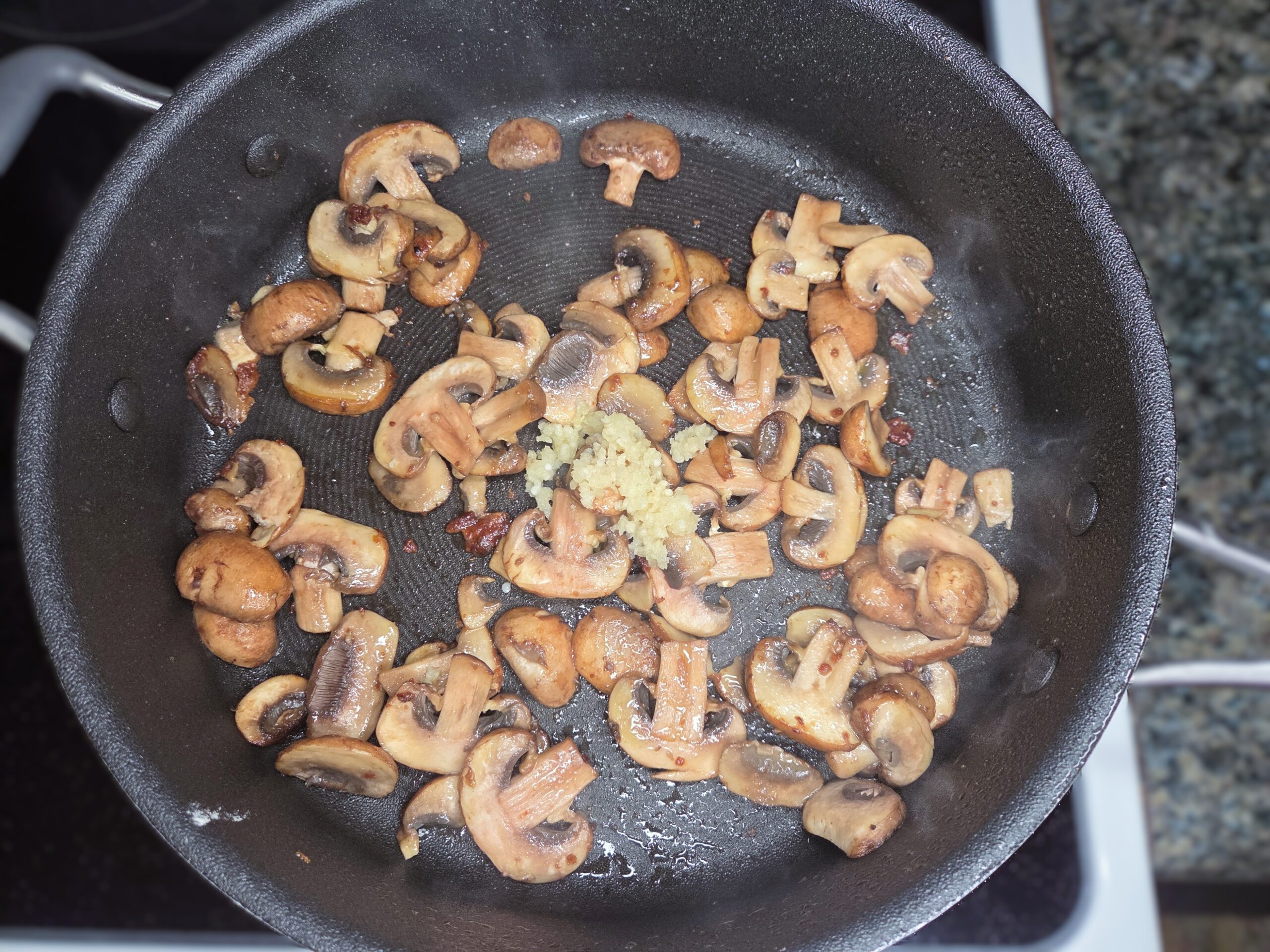 Add a little more extra virgin olive oil if the pan looks dry, then stir in the mushrooms and cook them until they’re deeply browned and their moisture has evaporated. When the mushrooms are golden and caramelized, add the minced garlic and sauté for about a minute, just until fragrant, so it doesn’t burn.