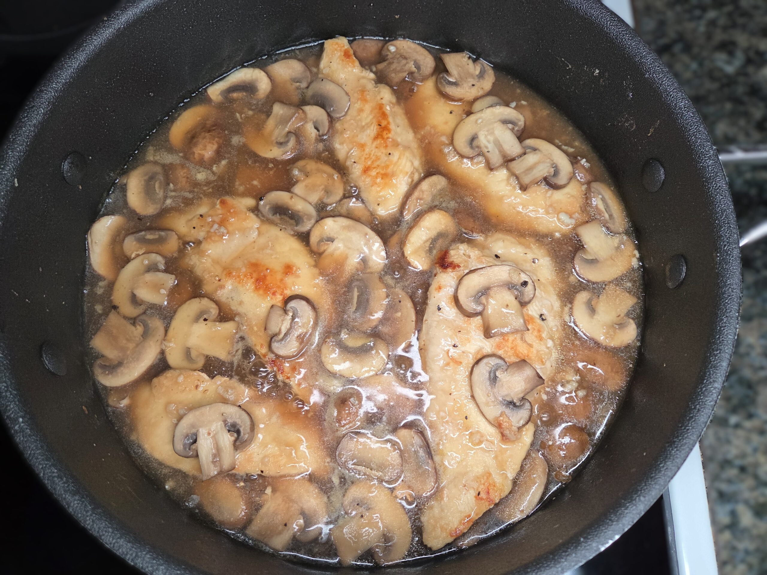 Pour in 3/4 cup Marsala wine and let it simmer for a couple of minutes to reduce slightly and loosen the browned bits from the bottom of the pan. Add 1 cup of chicken broth and stir in the cornstarch slurry, letting the mixture return to a gentle simmer so the sauce thickens and turns glossy.