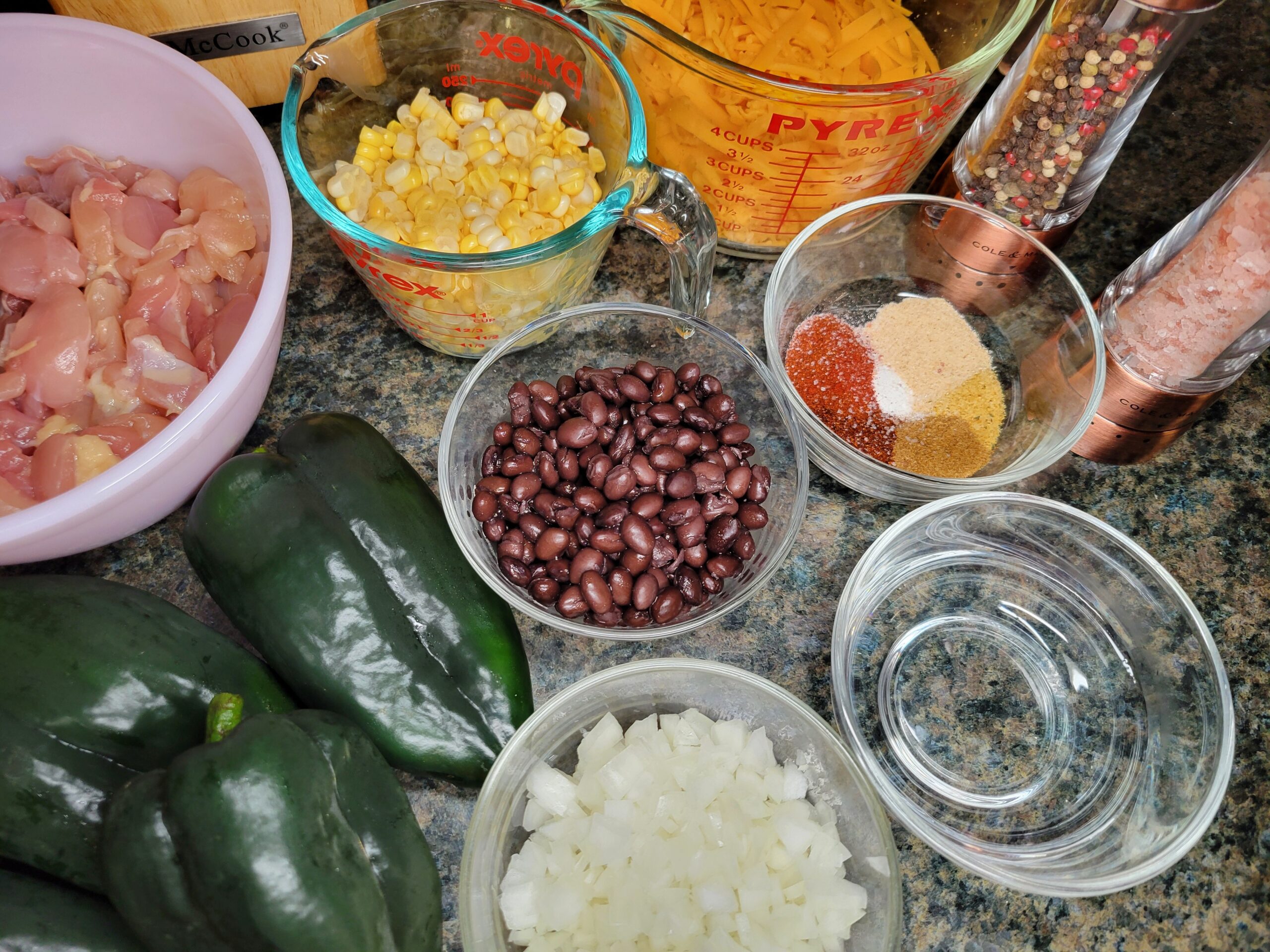 Prepare the other ingredients. Drain and rinse the black beans, then measure out 1 cup. Husk, wash, and carefully cut the kernels off the corn, or if using canned, drain and measure out 1 cup of corn. Dice the chicken thighs into 1/2-inch pieces. Finely dice half an onion. Measure out 1/2 cup of water and shred 2 1/2 cups of sharp cheddar cheese. Wash the poblanos and pat dry. Have salt and pepper ready to use.