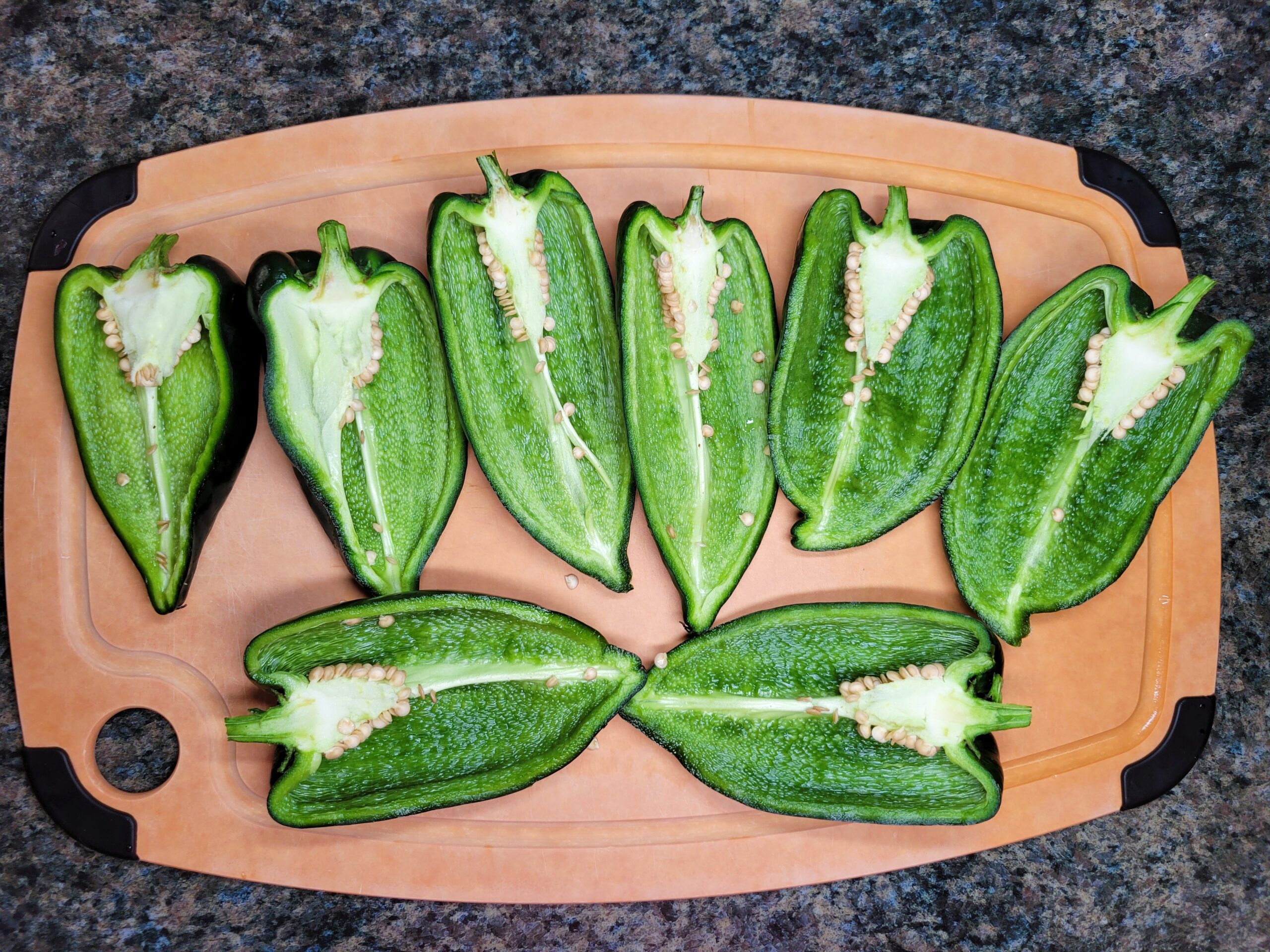 Cut the poblanos in half lengthwise and take out the seeds and membranes.