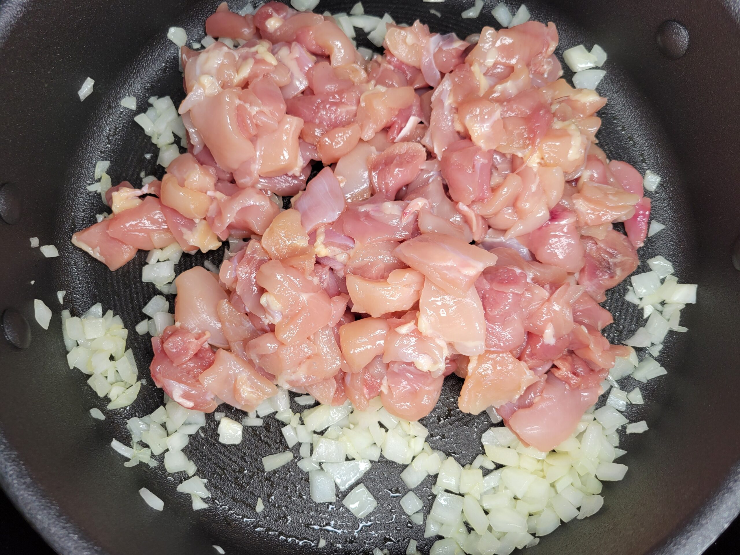 While the poblanos are in the oven, prepare the filling. Heat 2 teaspoons of oil in a large skillet over medium heat. Add diced onions cooking for a few minutes then add chicken thighs, stirring occasionally as they cook. Continue cooking until the chicken is fully cooked through, then drain any excess grease.