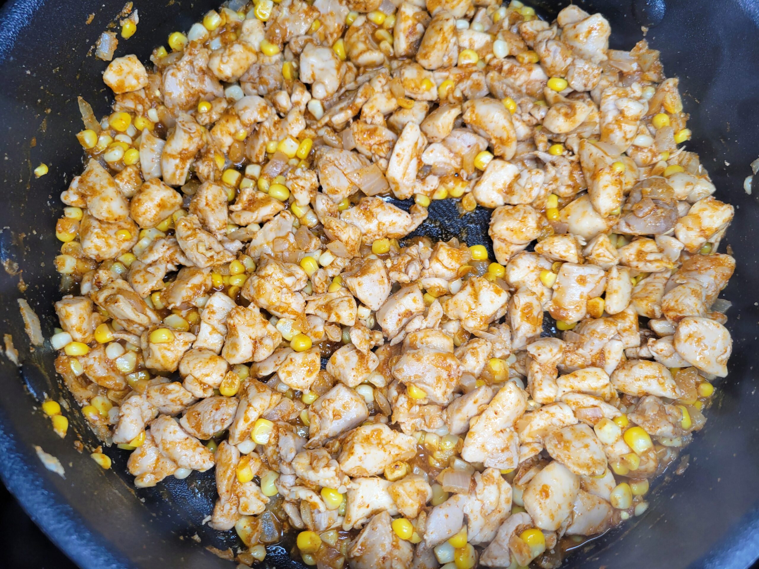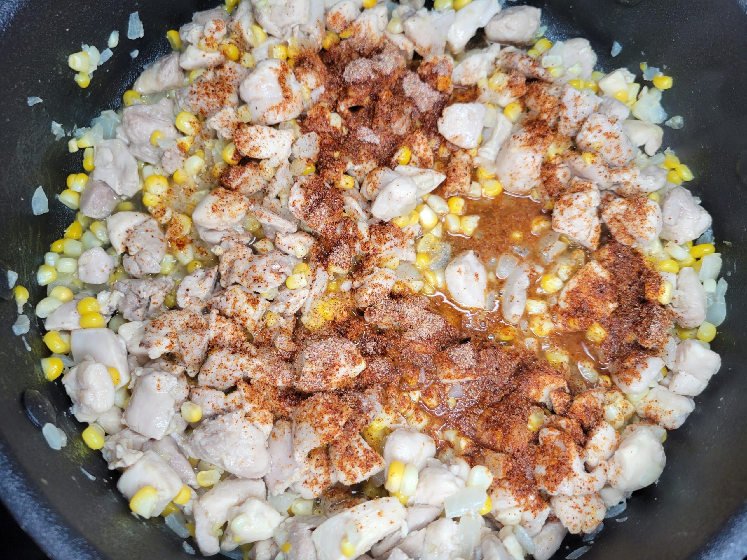 Add the corn to the skillet and cook for a few minutes, stirring occasionally, until the raw kernels turn bright yellow.