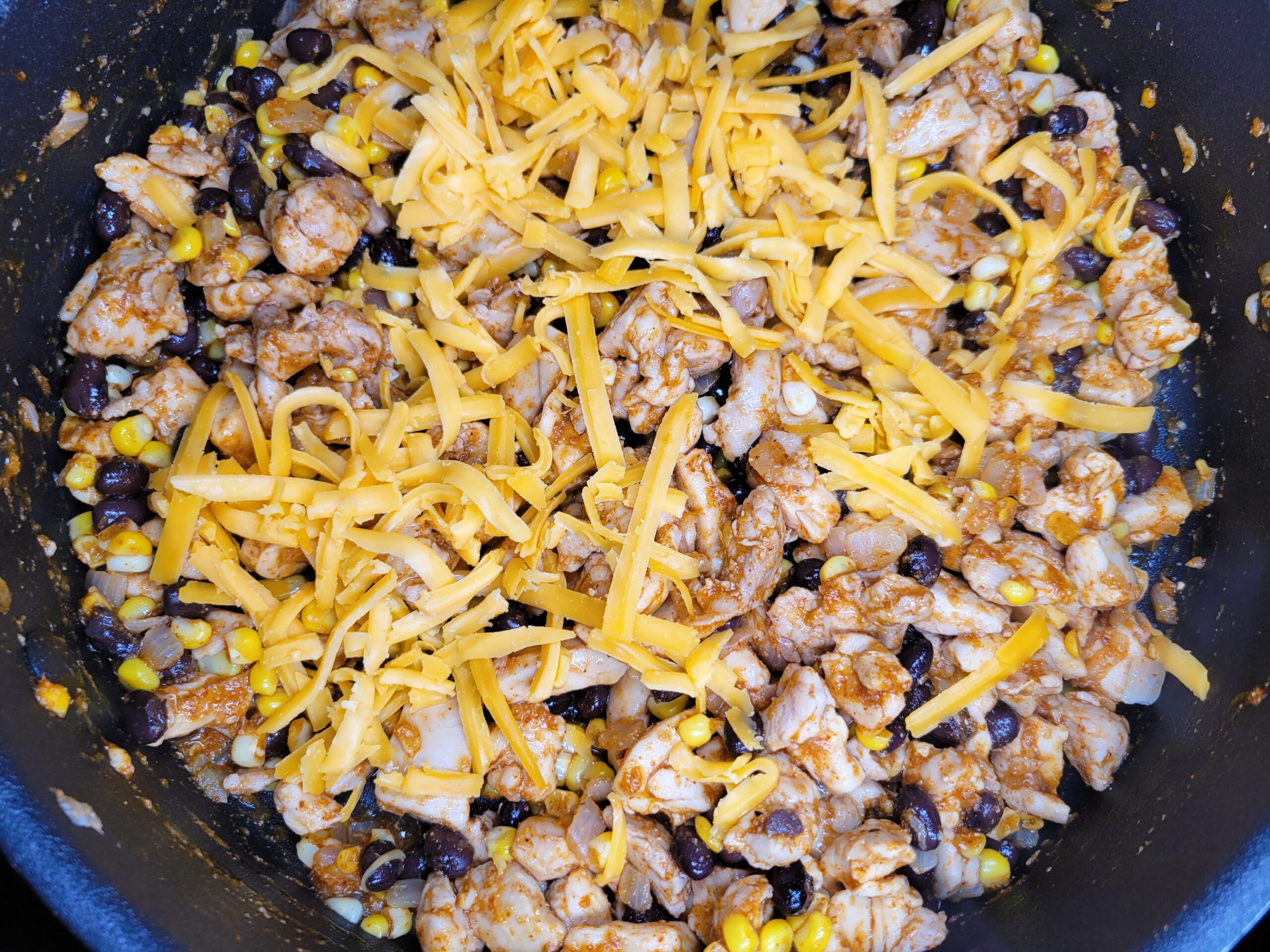 Take off the heat and mix in 1 cup of black beans and 1 cup of shredded cheese. Stir until well combined.