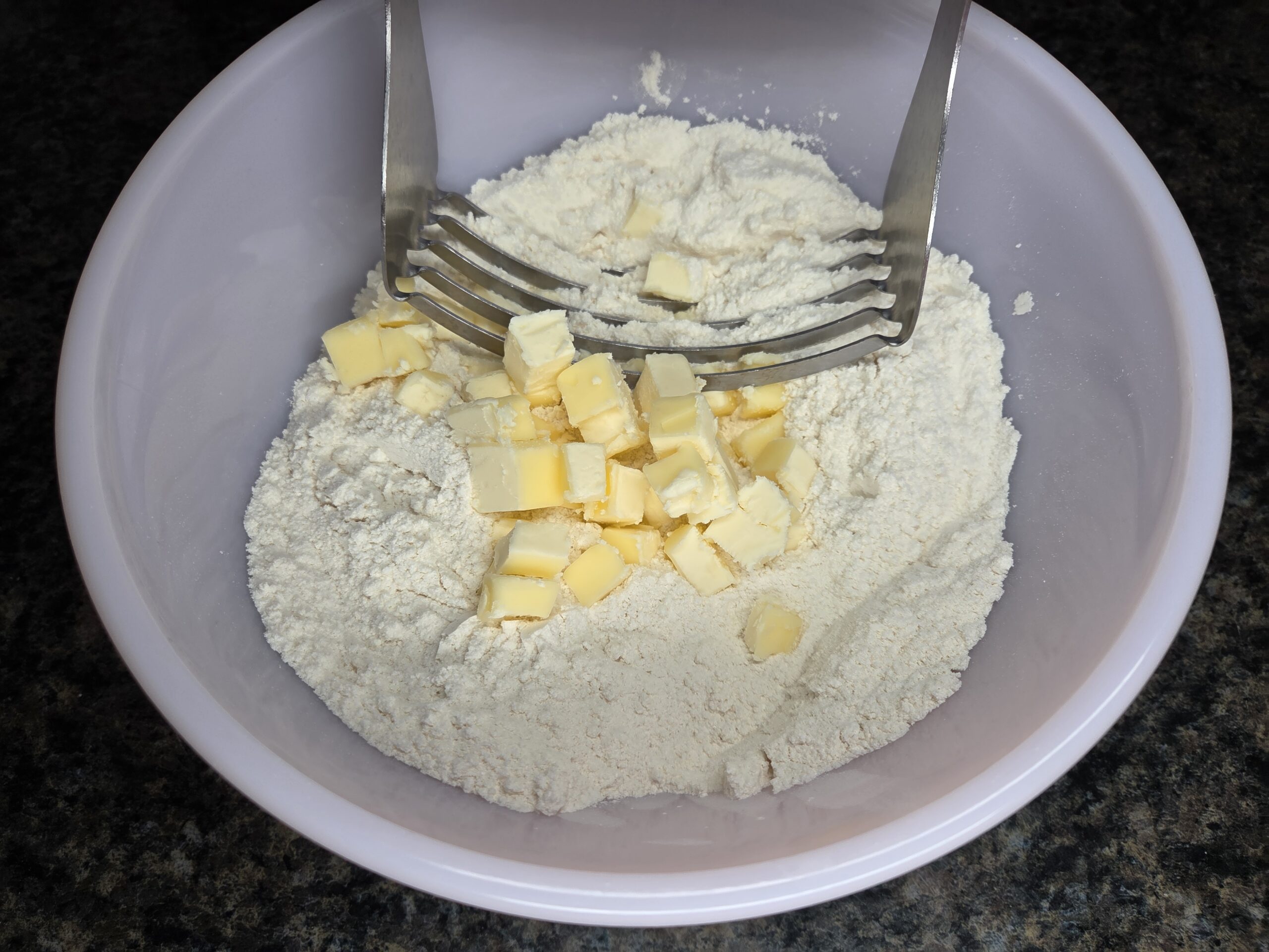 Add 1/2 cup cold butter cubes, then use a pastry cutter, a fork, or your fingers to work it into the flour until the mixture resembles coarse crumbs.