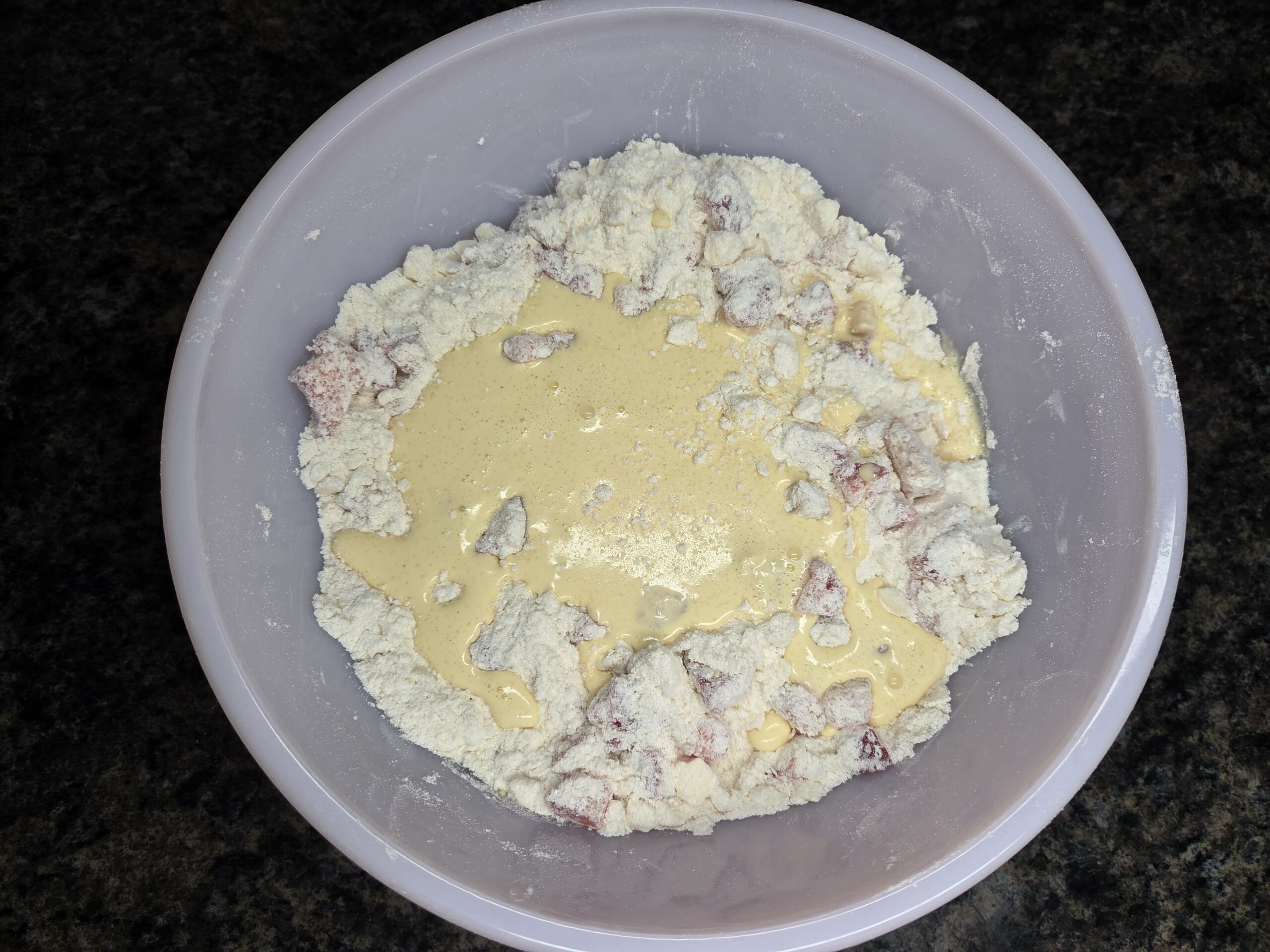 Dice ¾ cup of hulled strawberries and gently fold them into the mixture.