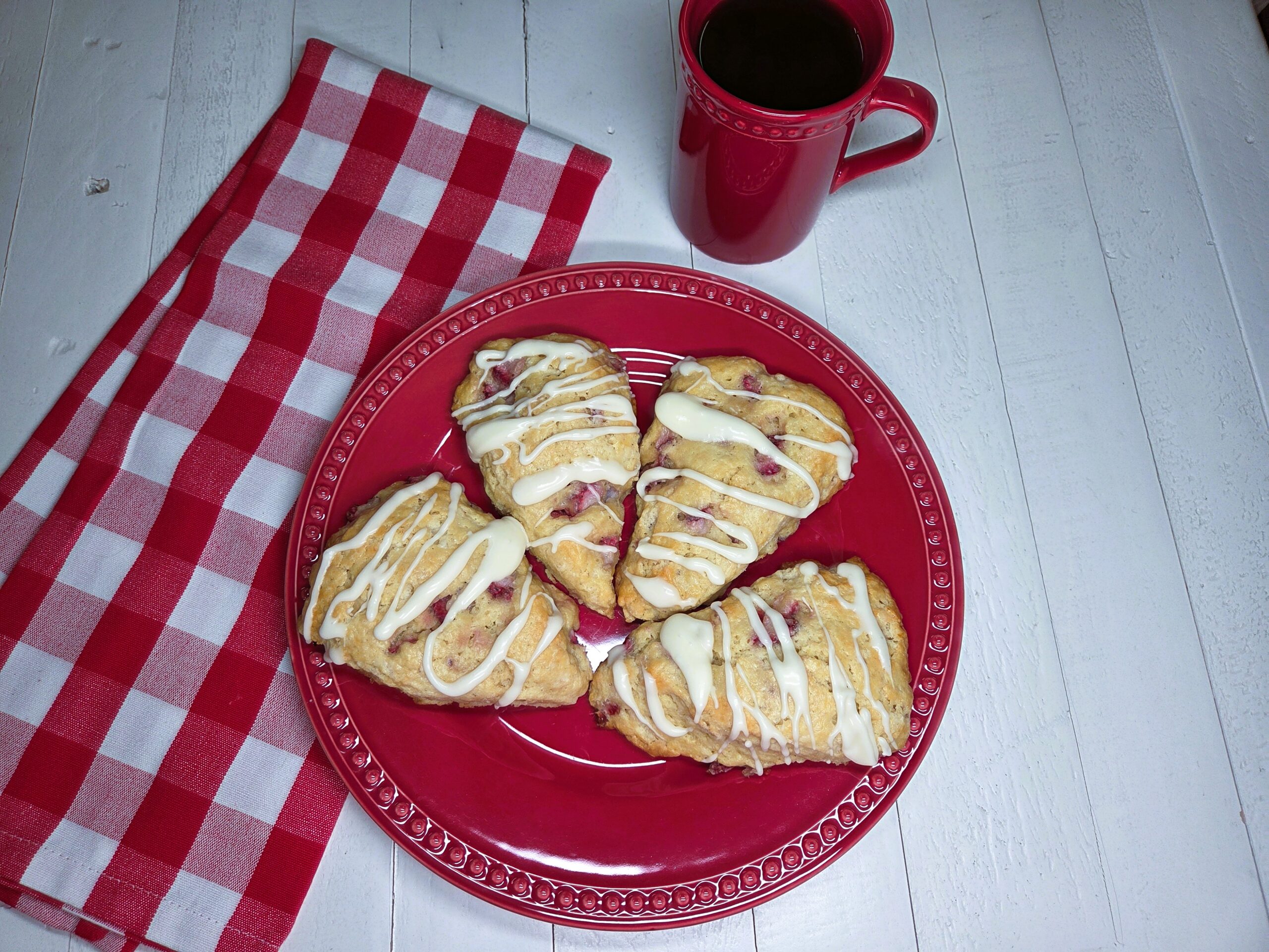 In a medium bowl, combine 1 cup powdered sugar, 1 teaspoon vanilla extract, and 1–2 tablespoons heavy whipping cream. Add more cream as needed until the glaze reaches your desired consistency. Drizzle the vanilla cream icing over the scones in a zig‑zag pattern. Allow the icing to set up for about 15 minutes.