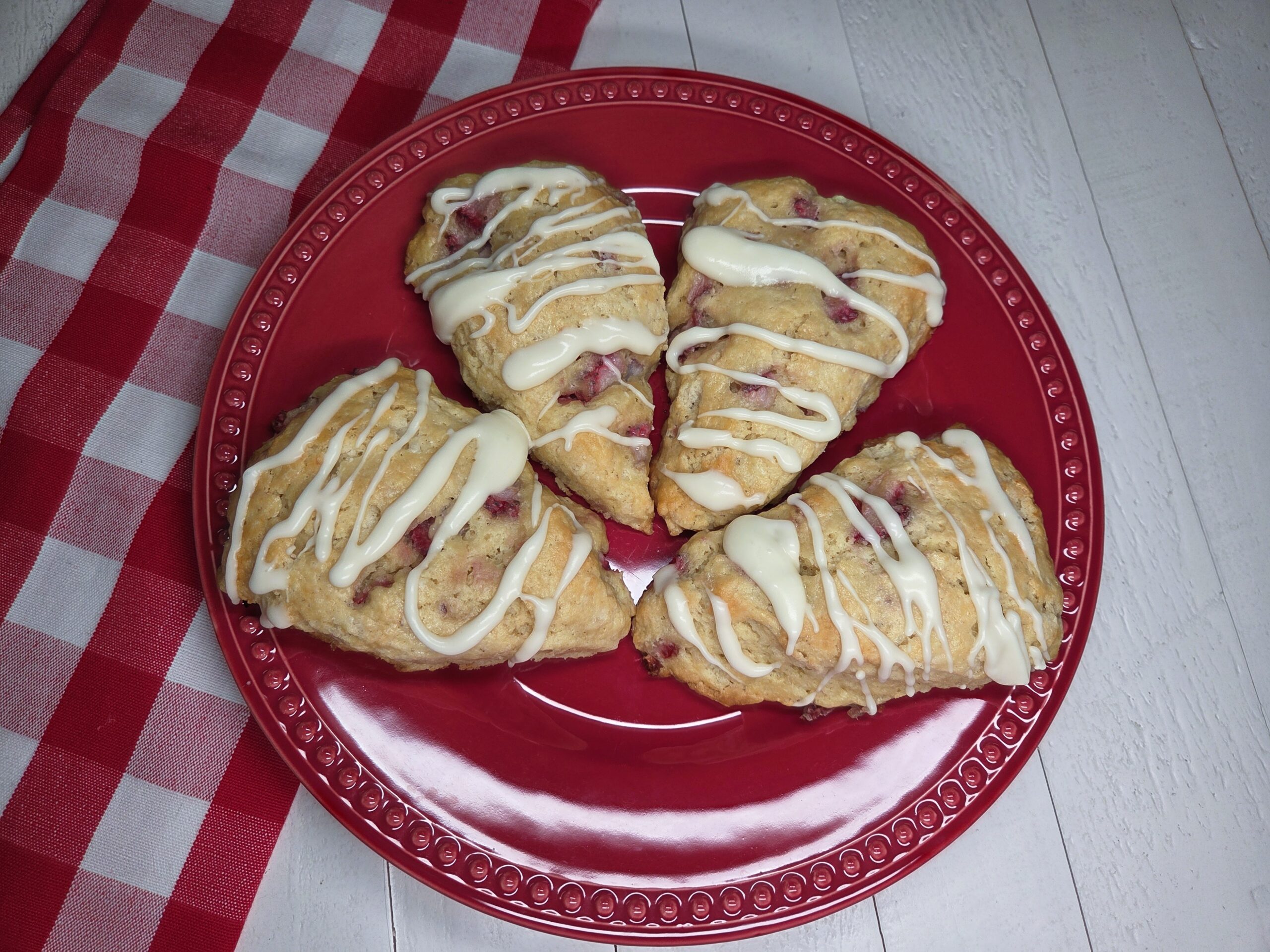 Delicious Strawberries and Cream Scones are studded with fresh strawberries and topped with vanilla cream icing.