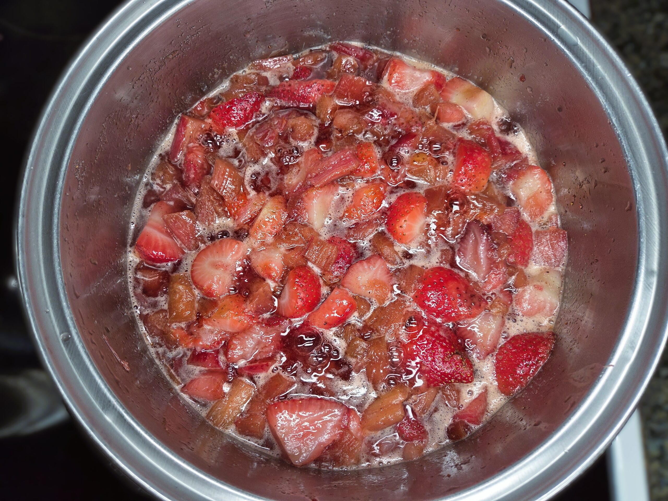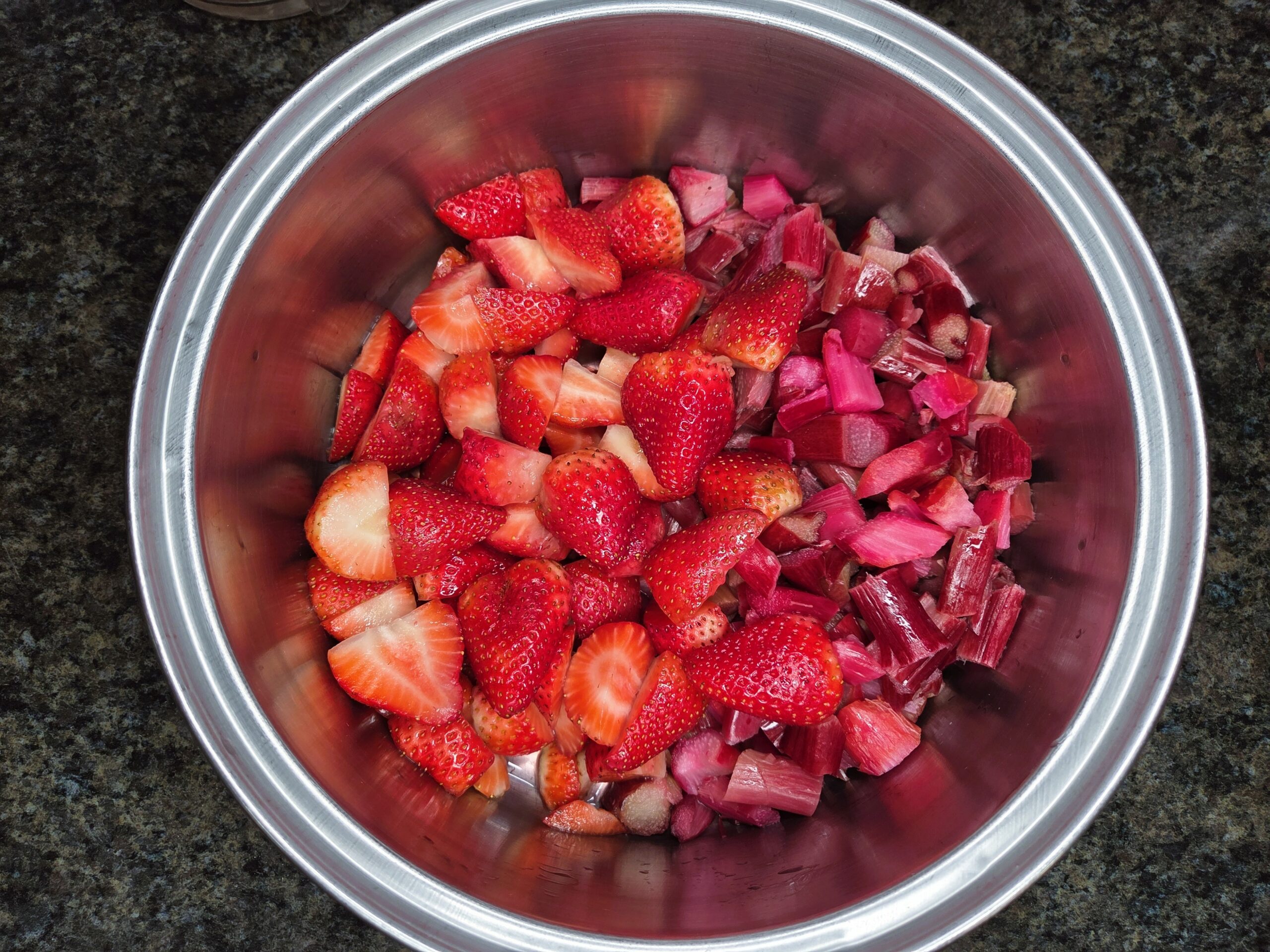 Prepare your ingredients: Rinse, trim, and dice the rhubarb into 1‑inch pieces. Rinse and stem the strawberries, then cut them in half. If you prefer a smoother jam with fewer chunks, cut the strawberries into smaller pieces. Place 5 cups of each into a stainless‑steel, non‑reactive 5‑quart pot over medium heat.